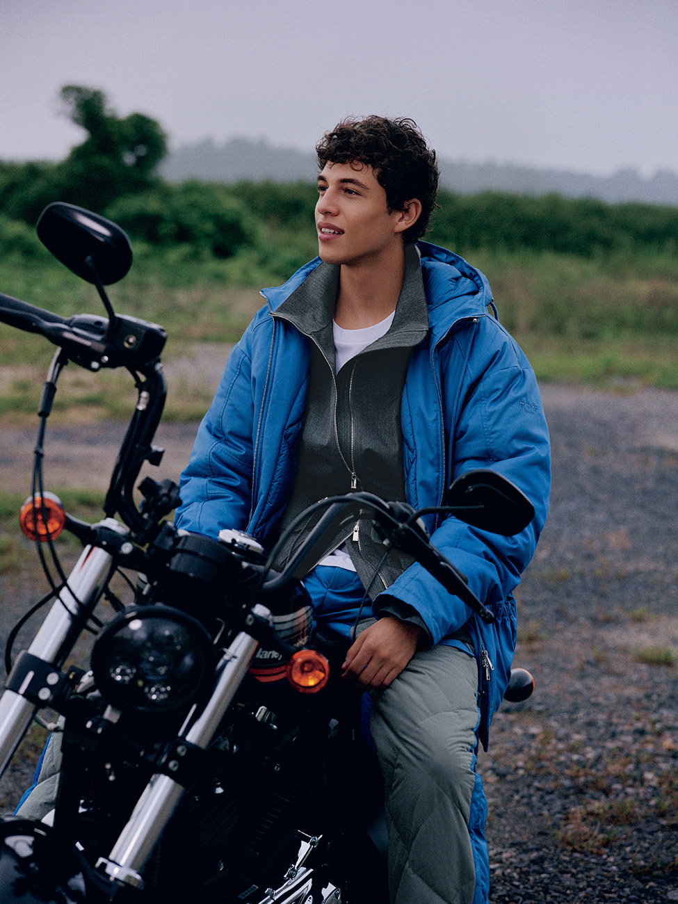 ’70年代のオーセンティックなデザインにインスパイアされたダウンジャケットは、コットンとナイロンを高密度に織り上げた、ハリのあるタイプライター素材。カジュアルな雰囲気がありながら、グレーとネイビーのコントラストカラーがシックだ。ダウンジャケット¥187,000、ヴァーシティダウンジャケット¥176,000、クルーネックTシャツ¥24,200、パンツ¥57,200、レザースニーカー¥59,400(すべてタトラス/タトラス カスタマーセンター ☎03·6277·1766)