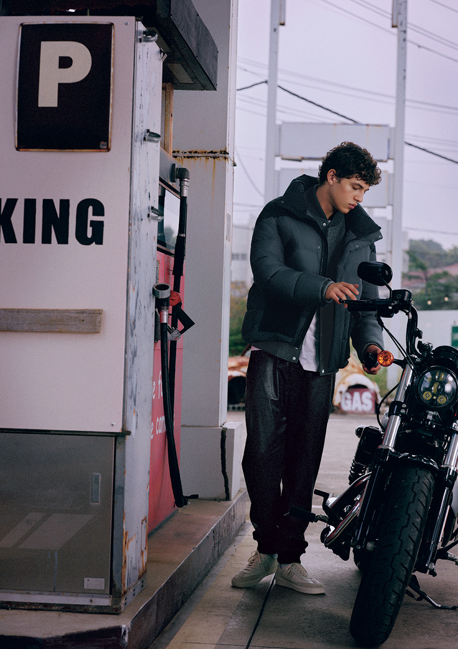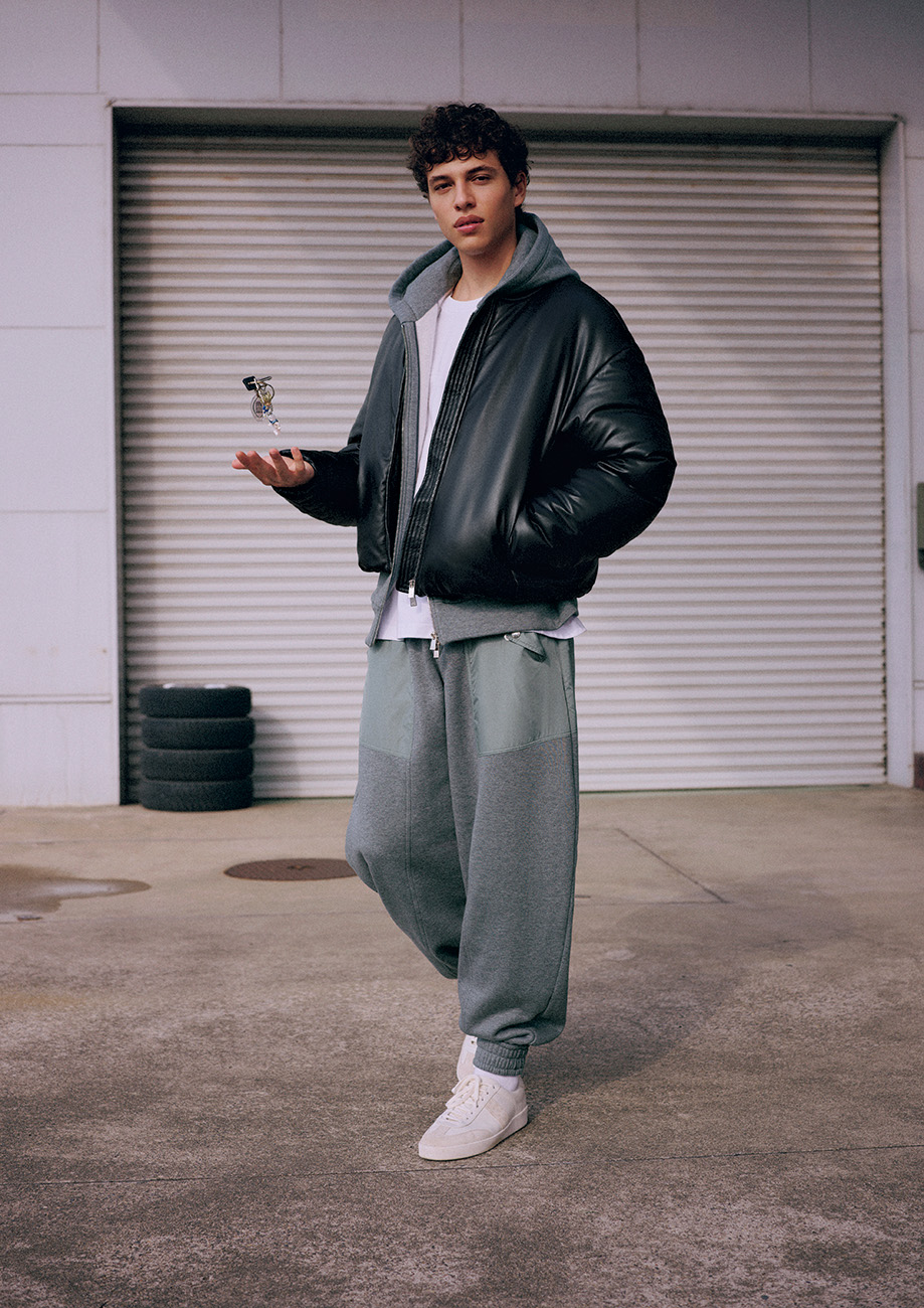 〈タトラス〉の新作には、’70sの軽快なスポーツスタイルと構築的なミリタリーの要素が融合したピースが揃う。シボ感のあるエコレザーを使ったダウンブルゾンは、ダウンがたっぷりと詰まった丸みあるオーバーシルエットで洗練された顔つき。ダウンブルゾン¥181,500、フルジップスウェットフーディー¥48,400、クルーネックTシャツ¥24,200、スウェットパンツ¥44,000、レザースニーカー¥59,400(すべてタトラス/タトラス カスタマーセンター ☎03·6277·1766)