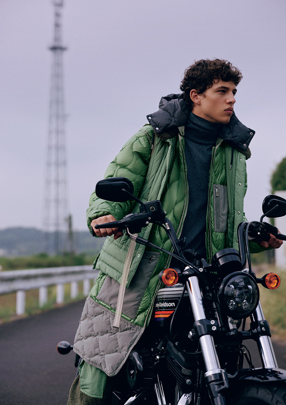 ヴィンテージさながらの風合いのツイル地のダウンベストは、アウターの上に着てもスマートなサイズ感。オニオンステッチにミリタリームードが漂うダウンコートとレイヤードして、異なるグリーンのトーンの重なりを楽しみたい。ベルテッドダウンベスト¥110,000、フーデッドダウンコート¥209,000、タートルネックニット¥44,000、カーゴパンツ¥63,800(すべてタトラス/タトラス カスタマーセンター ☎03·6277·1766)