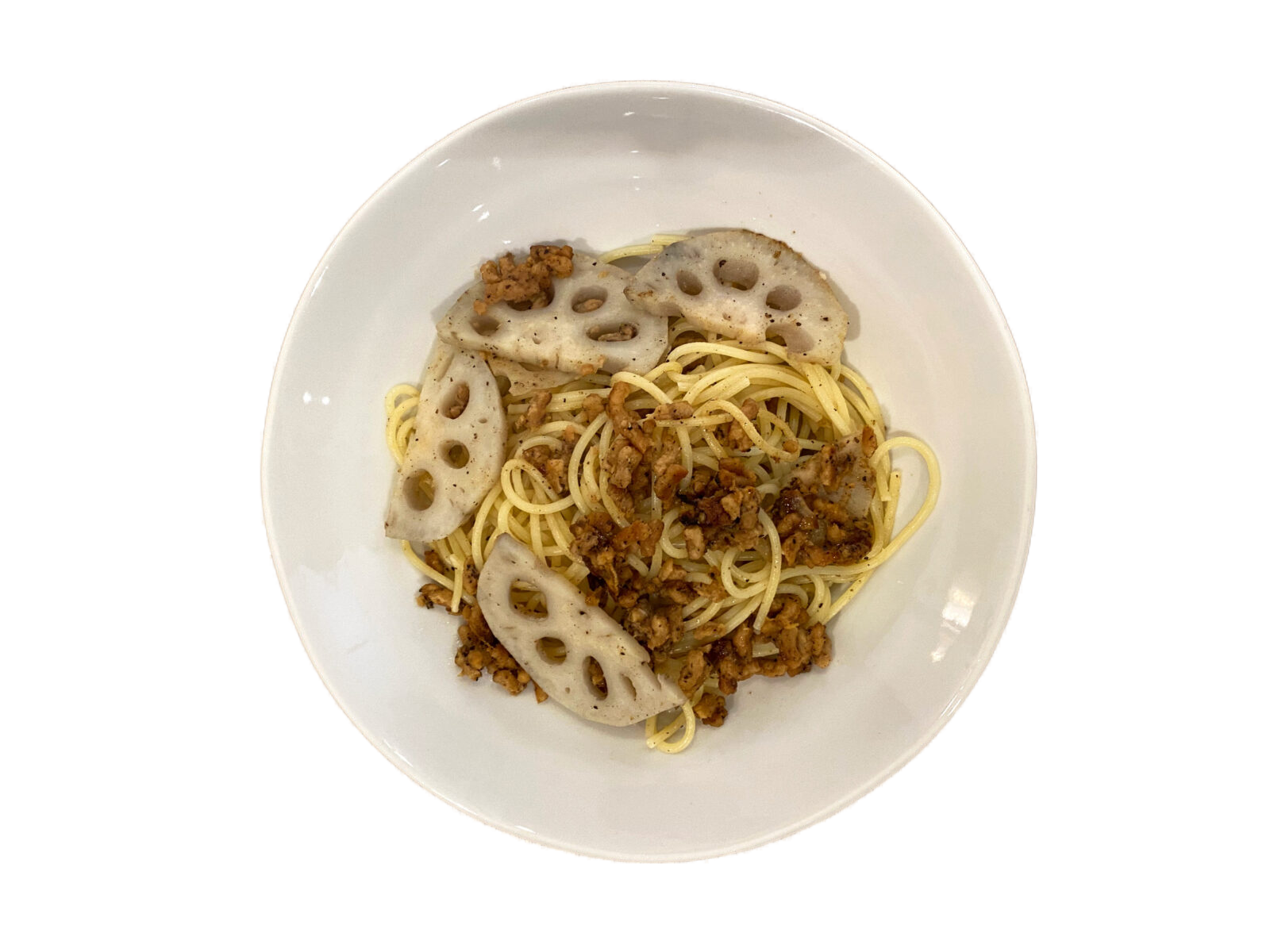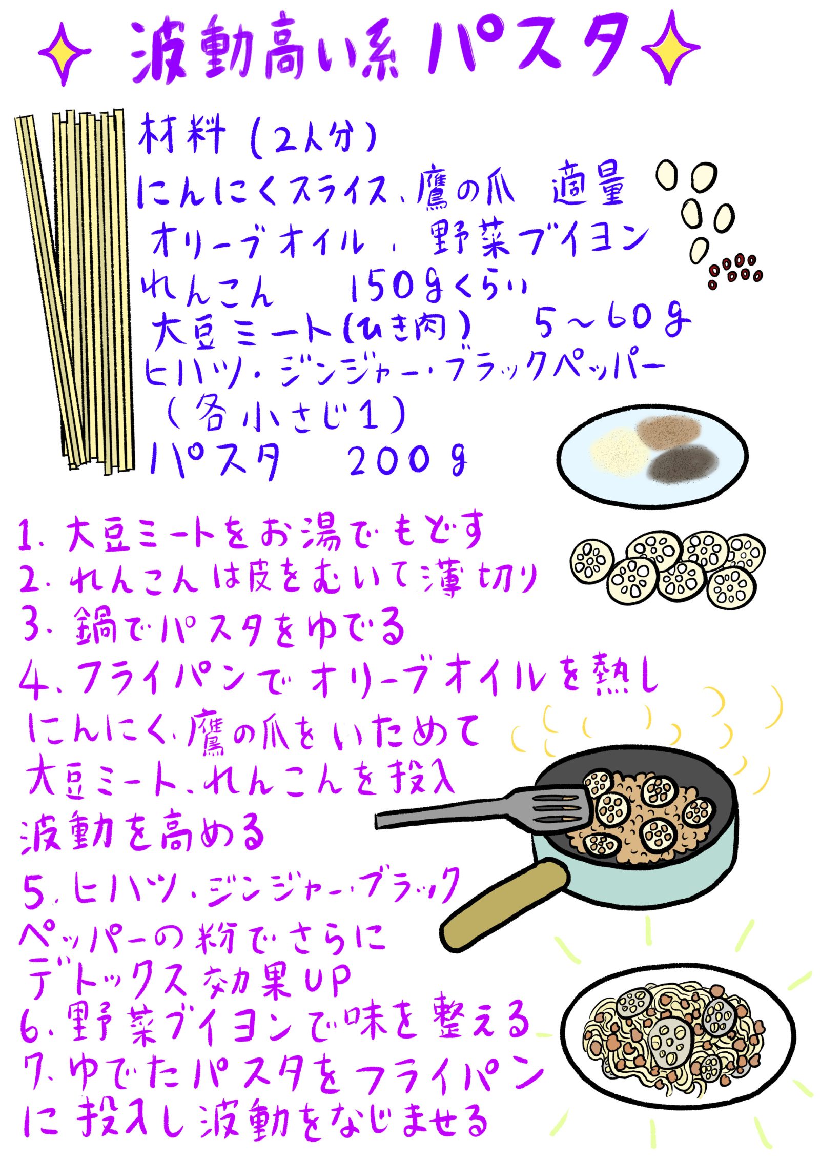 久しぶりの連載第4回目。気候も暖かくなり、そろそろ新しいメニューに挑戦したい! ということで今回依頼したのは漫画家でコラムニストの辛酸なめ子さん。いつも魅力的な文章やイラストを描くなめ子さんなら何か面白いレシピを教えてくれそうな気がしていた。予感は的中。届いたレシピは「波動高い系パスタ」。若干怪しいな、とは思いつつレシピを見ると、大豆ミートとれんこんを、香辛料とにんにくで味付けするシンプルパスタのよう。3種のスパイス(ヒハツ+ブラックペッパー+ジンジャー)にはデトックス効果もあるらしく、早速調理をスタート! とりあえず、疑念がどうでもよくなる程あっという間に完成。これぞ「USEFUL SPAGHETTI RECIPE」だ。いざ実食すると、大豆ミートの柔らかさとれんこんのジャキジャキした食感のコントラストが地味に楽しい(れんこんもっと小さく切ってもいいかも)。ヒハツの辛さとジンジャーのハツラツとした小さな熱気も体感。枝豆のように、ずっと食べていられる疲れない感じと、スパイスの程よいピリっと感、きっとビールのあてにもイケるはず。シンプルな工程&ビジュアルながら体中を浄化してくれるスパゲッティレシピ、しかと受け取りました。なめ子先生、次回はセージも入れてみます! あ〜幸せ幸せ。