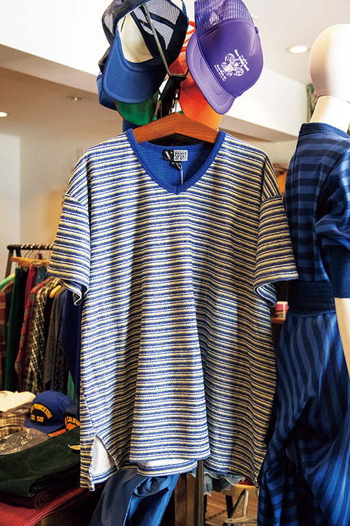 最後にTシャツのレギュラーを考えてみたい。それを知りたかった夏が近づくと、店内の半分以上をTシャツに入れ替える『Young』へ。個人が適当に写真をプリントして作った通称“誰やねんT”などオーナー石橋誠也さんがピックした、いなたくて楽しいデザインが多数入荷中。昨年、新スタッフのYOSUKEさんが店にジョイン。彼の得意なテックなパンツや小物も充実してきた。夏の準備はここで一丁あがり。
