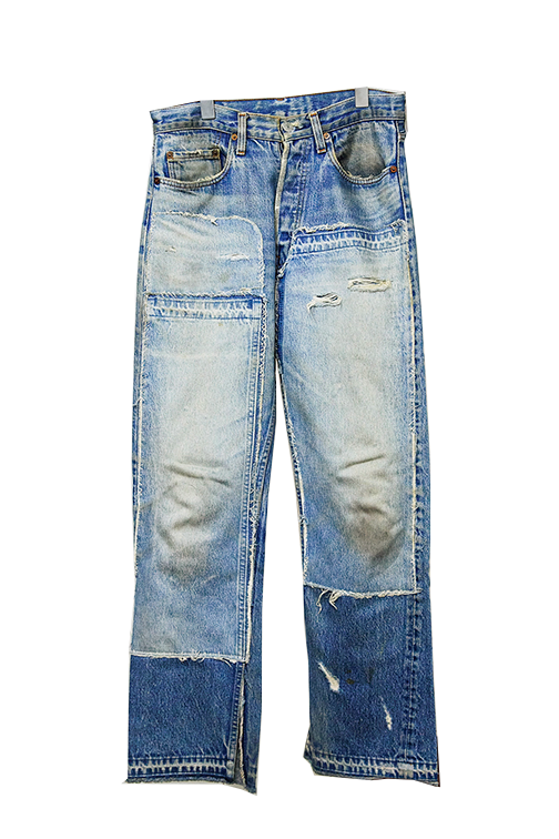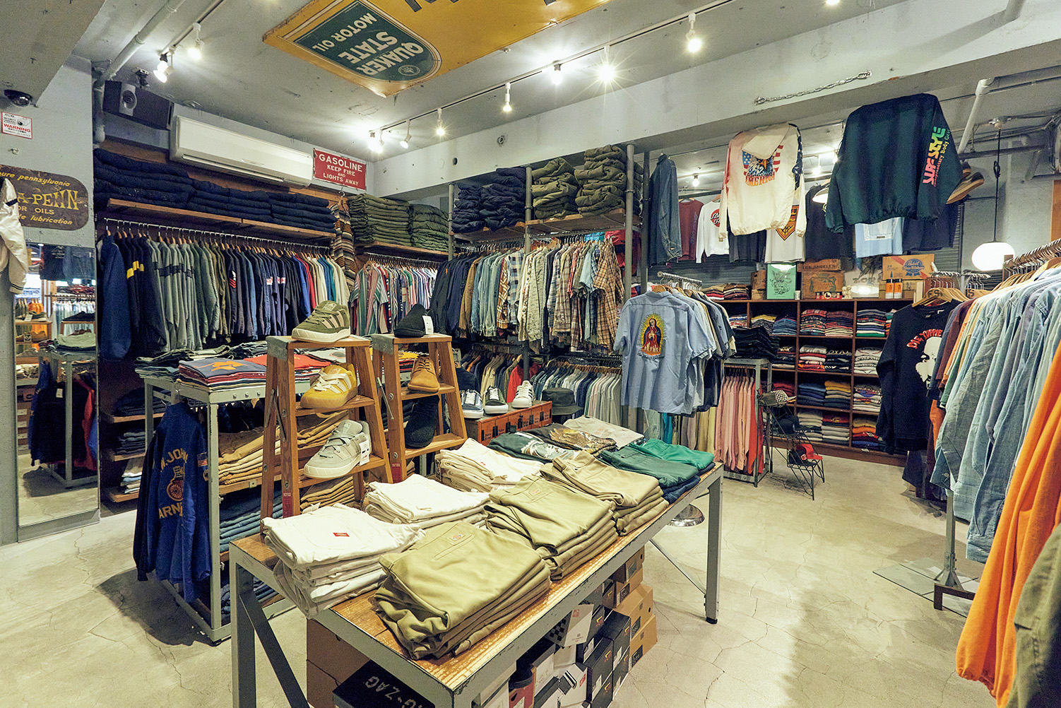 USA製の〈ディッキーズ〉や、〈リーバイス〉の「シルバータブ」がラックにずらりと並び、天井近くまで積み上げられた軍パンの山。どれも単発ではなく、カテゴリーごとに選べる“面”でのラインナップが信頼できるアニキ的存在の『アス』。リフレクター付きのワークシャツ(左上、各¥6,490)など、痒いところに手が届くリメイクアイテムも見応えがある。ジャンルの枠を超えて遊びを効かせたセレクトに、テンションのギアも一段階上がるってもんだ。