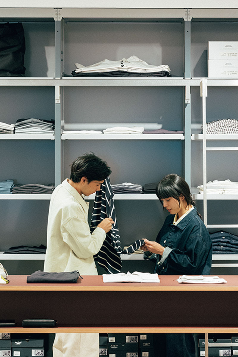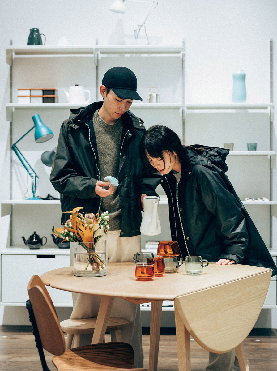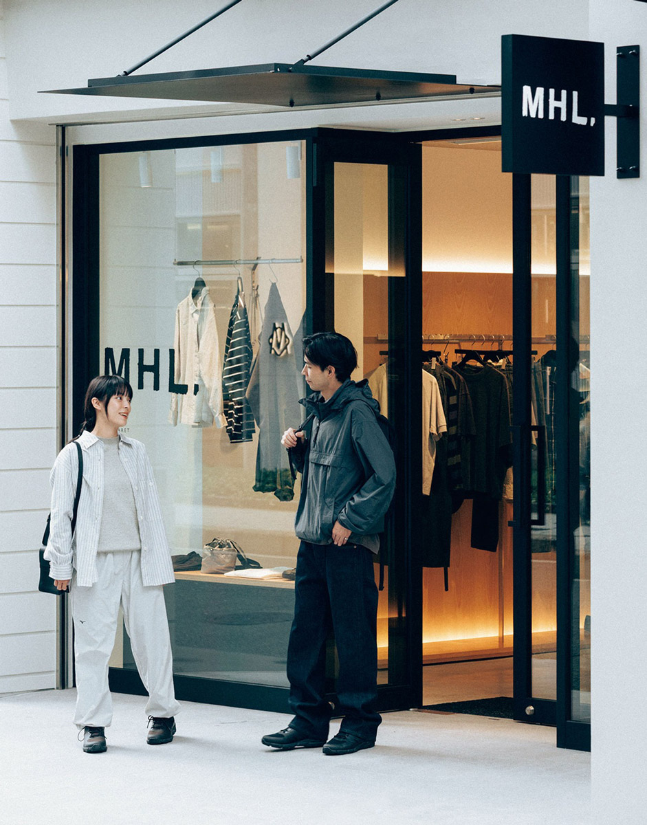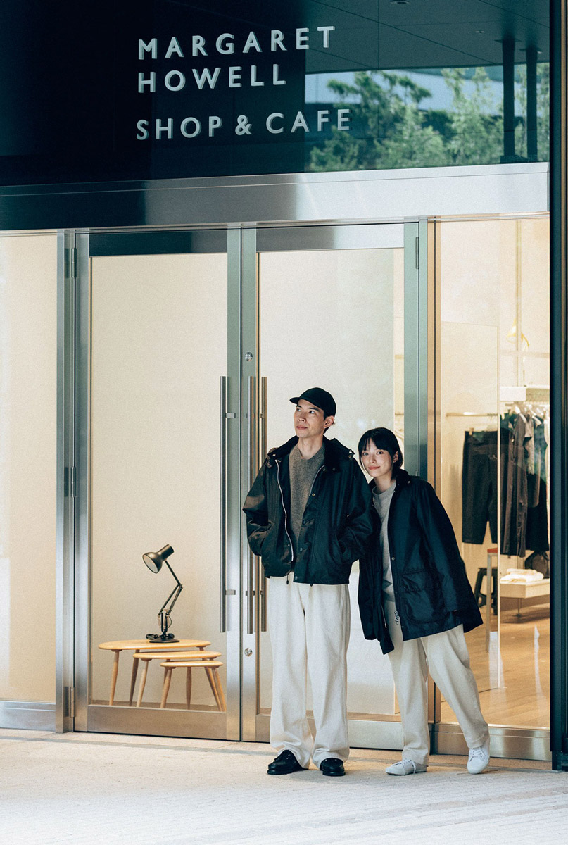 今年オープンした『マーガレット・ハウエル グラングリーン大阪』と『MHL. 南船場』を訪れたのは、荒井結生さんと髙橋東子さん。都内の古着店で働く結生さん、アウトドア派の東子さんは普段カジュアルな着こなしが多いとか。シャツをさらっと一枚で着るのも好きで、今日は仕立てのよいシャツ、そしてデニムのセットアップや〈マーガレット・ハウエル〉と〈バブアー〉のコラボコートなどに惹かれている様子。上質でモダンな〈マーガレット・ハウエル〉と素材感を楽しめる〈MHL.〉のアイテムはまさに今の気分に寄り添っていた。「長い間一緒にいるのでお互いの好みはわかりますね」と東子さん。選ぶスタイルはどこか呼応し、自然体で穏やかな二人の雰囲気によく馴染む。カフェでお茶をして、ホームプロダクトも見て、お店ならではのデートを満喫。