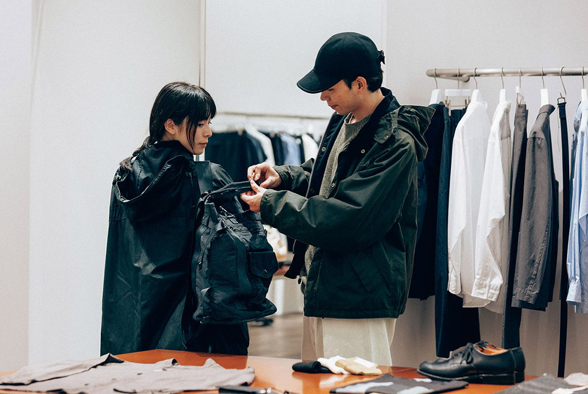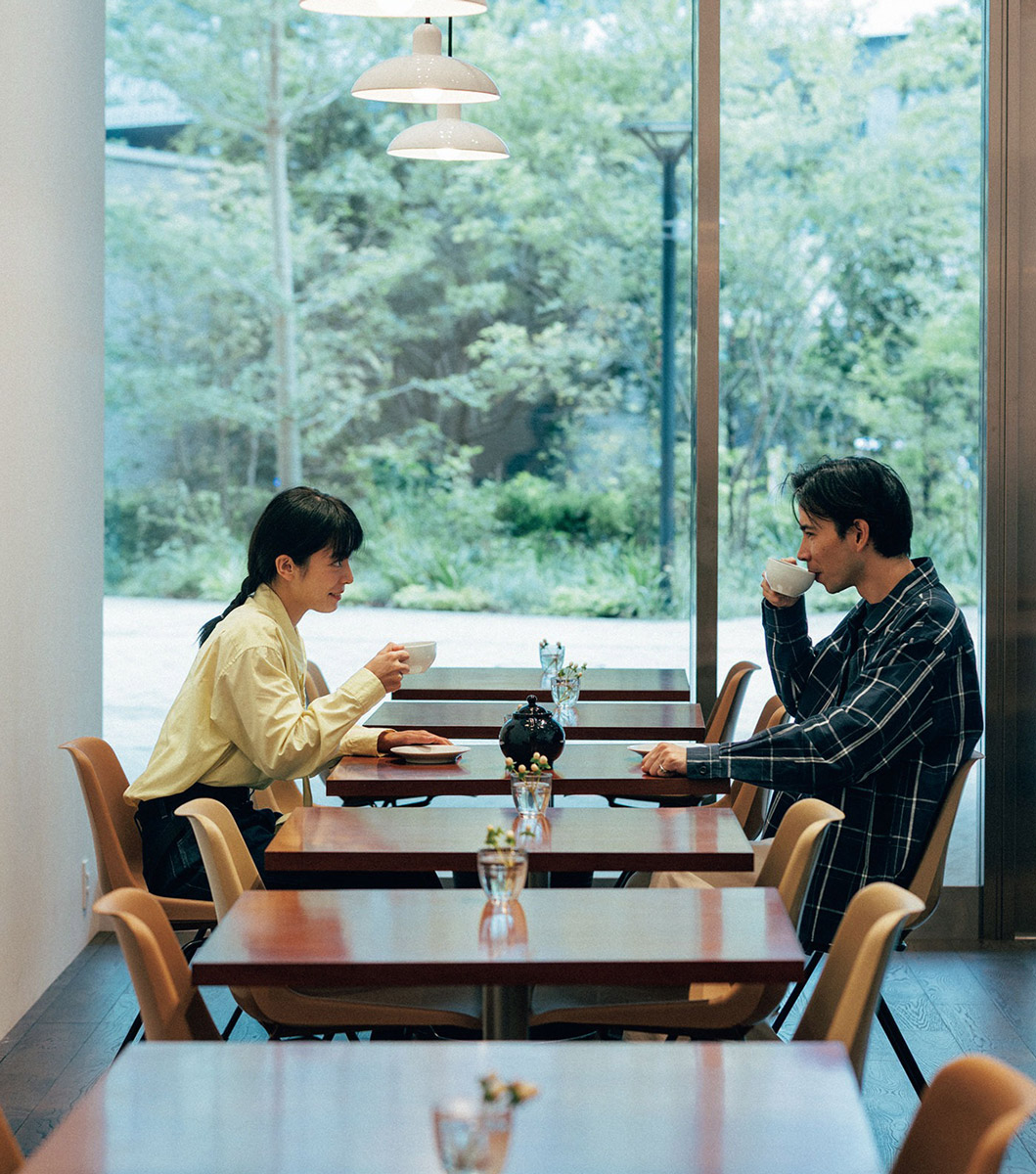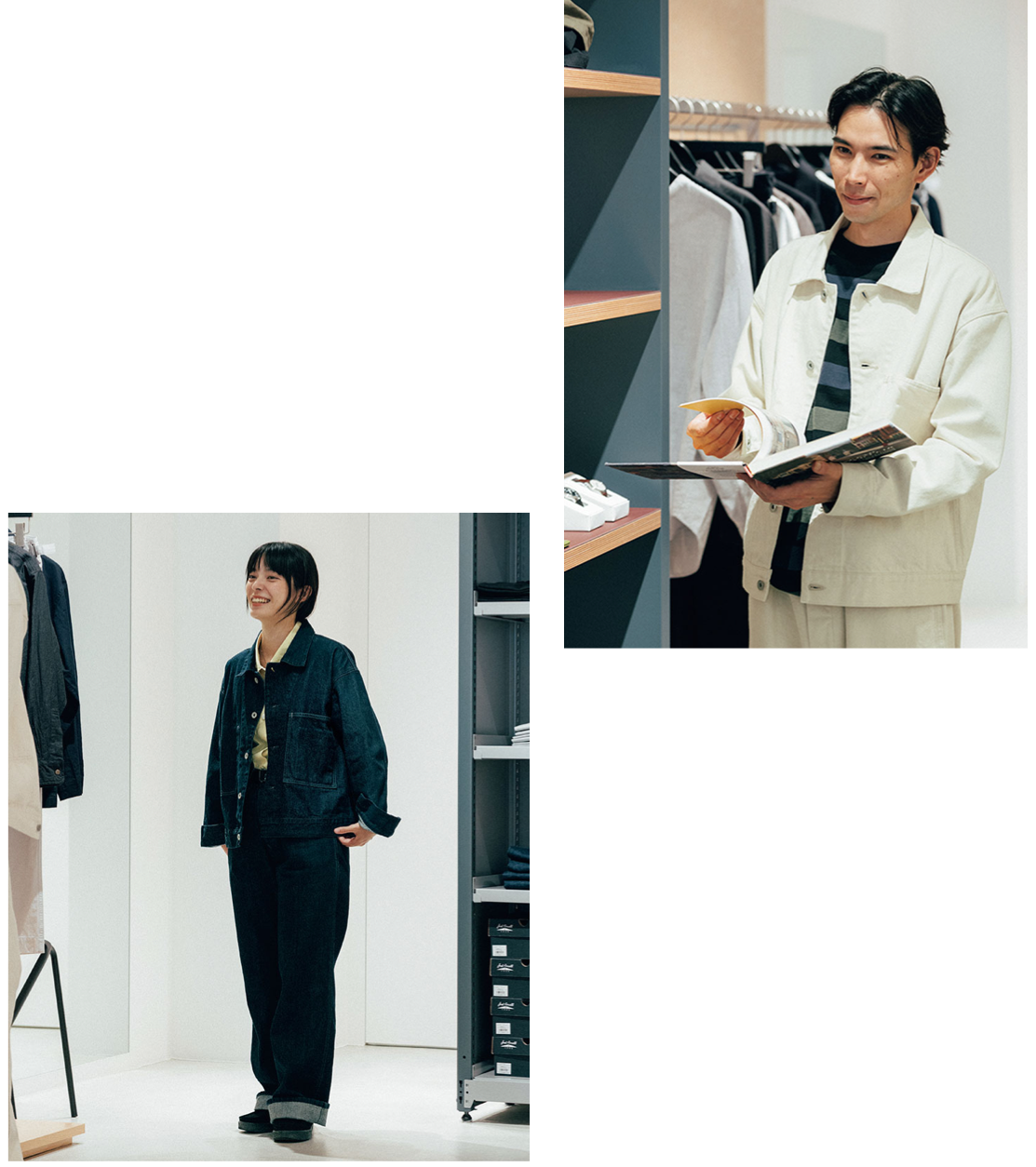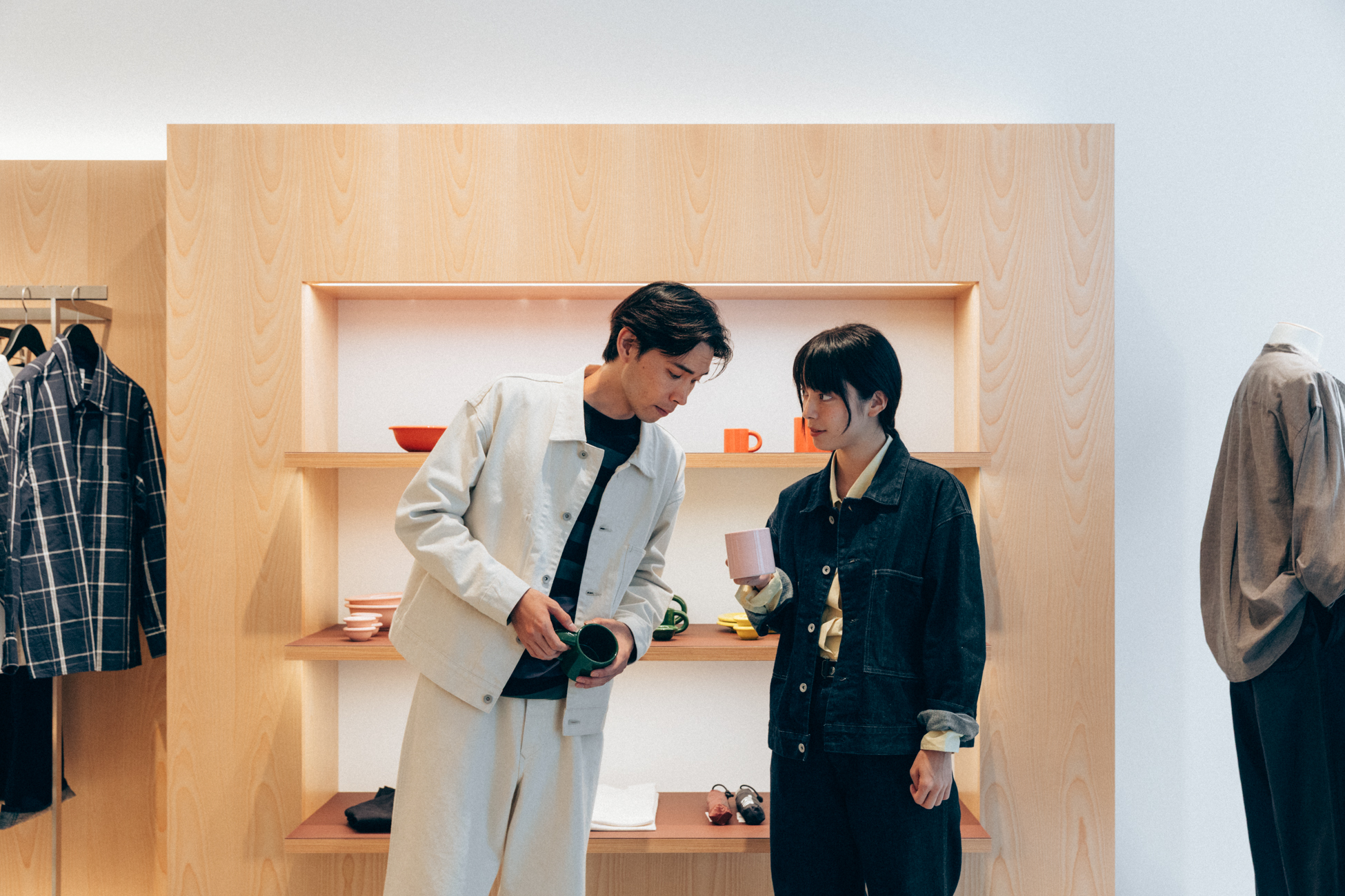 今年オープンした『マーガレット・ハウエル グラングリーン大阪』と『MHL. 南船場』を訪れたのは、荒井結生さんと髙橋東子さん。都内の古着店で働く結生さん、アウトドア派の東子さんは普段カジュアルな着こなしが多いとか。シャツをさらっと一枚で着るのも好きで、今日は仕立てのよいシャツ、そしてデニムのセットアップや〈マーガレット・ハウエル〉と〈バブアー〉のコラボコートなどに惹かれている様子。上質でモダンな〈マーガレット・ハウエル〉と素材感を楽しめる〈MHL.〉のアイテムはまさに今の気分に寄り添っていた。「長い間一緒にいるのでお互いの好みはわかりますね」と東子さん。選ぶスタイルはどこか呼応し、自然体で穏やかな二人の雰囲気によく馴染む。カフェでお茶をして、ホームプロダクトも見て、お店ならではのデートを満喫。