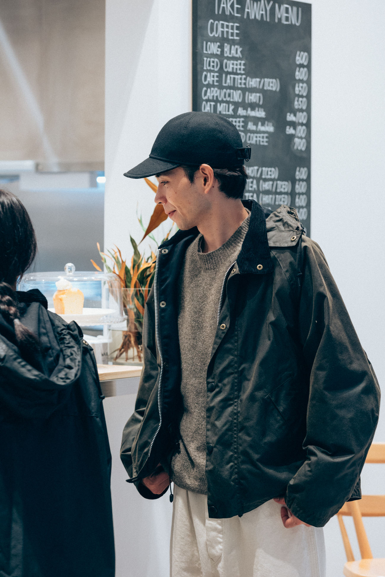 長く続く〈Barbour〉とのコラボレーション。結生さんが選んだ〈マーガレット・ハウエル〉のためにつくられたケルプカラーのジャケットは、スペイジャケットがイメージソース。東子さんが着ているのは、’60年代のソルウェイジャケットをオーバーサイズのミドル丈にアレンジした一着。結生さん/ジャケット¥79,200(バブアー フォー マーガレット・ハウエル)、ニット¥58,300、キャップ¥24,200(ともにマーガレット・ハウエル)、パンツ¥36,300(MHL.) 東子さん/ジャケット¥82,500(バブアー フォー マーガレット・ハウエル/すべてマーガレット・ハウエル☎03·5785·6445)