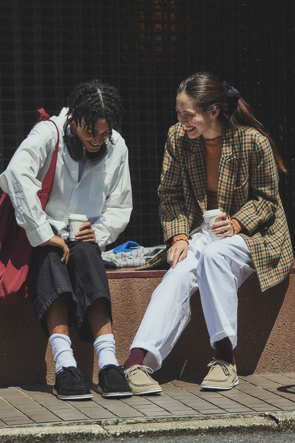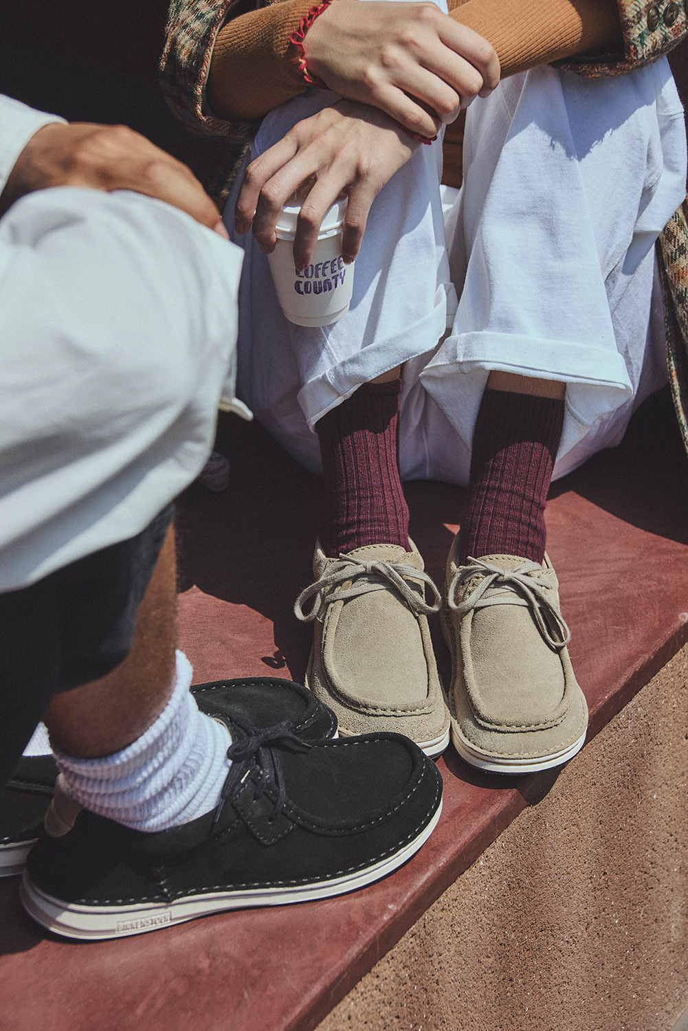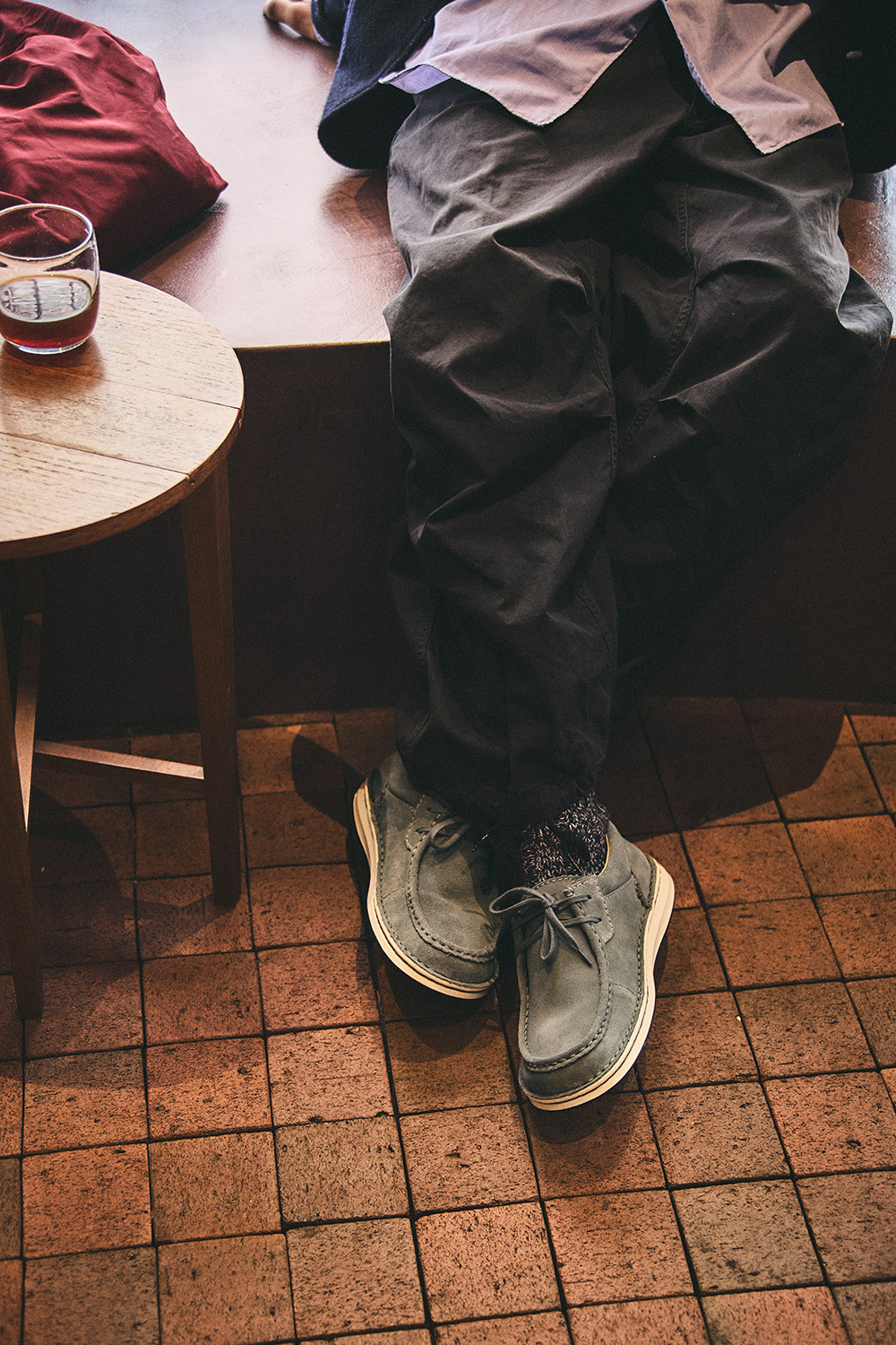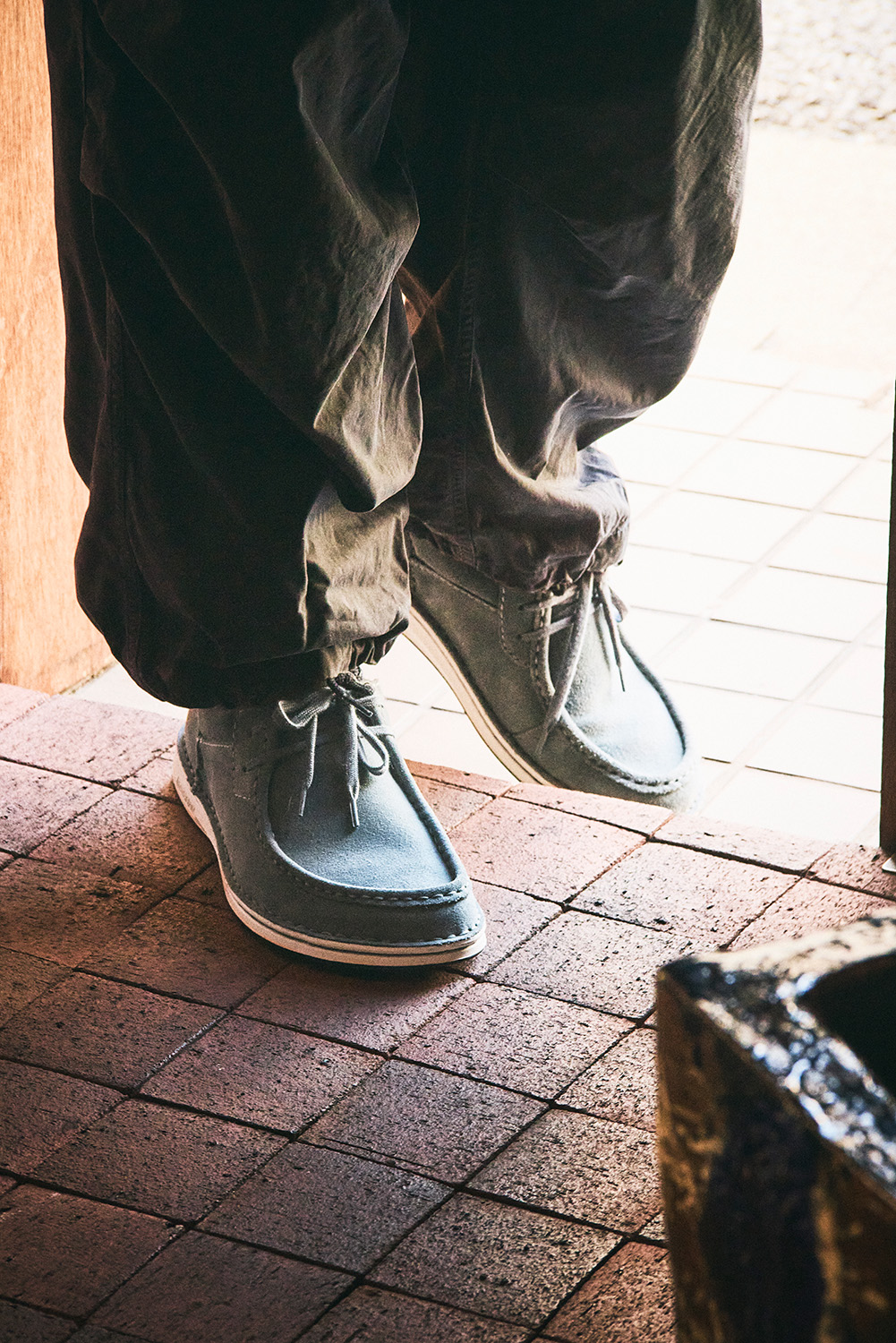 しかし、こうやってコーヒーを飲みながら上から靴を眺めてみると、コロンと丸みを帯びたモックトゥのデザインに惚れ惚れする。一見すると、チロリアンシューズのような見た目だけど、横から見るとボリューム感は薄く、デッキシューズのように軽やか。何より、このポリウレタン製ホワイトソールが効いている。1993年のデビュー当初はブラックだったソールを、1994年からホワイトに変更したことで、この“モックトゥ&ホワイトソール”の組み合わせが裏原文脈に刺さって定番になった……というのは、当時を知る先輩から教えてもらったこと。でも、それも納得のグッドデザインだ。’90年代に初めてこの靴を見た若者は、その格好良さに痺れたんだろうなぁ。