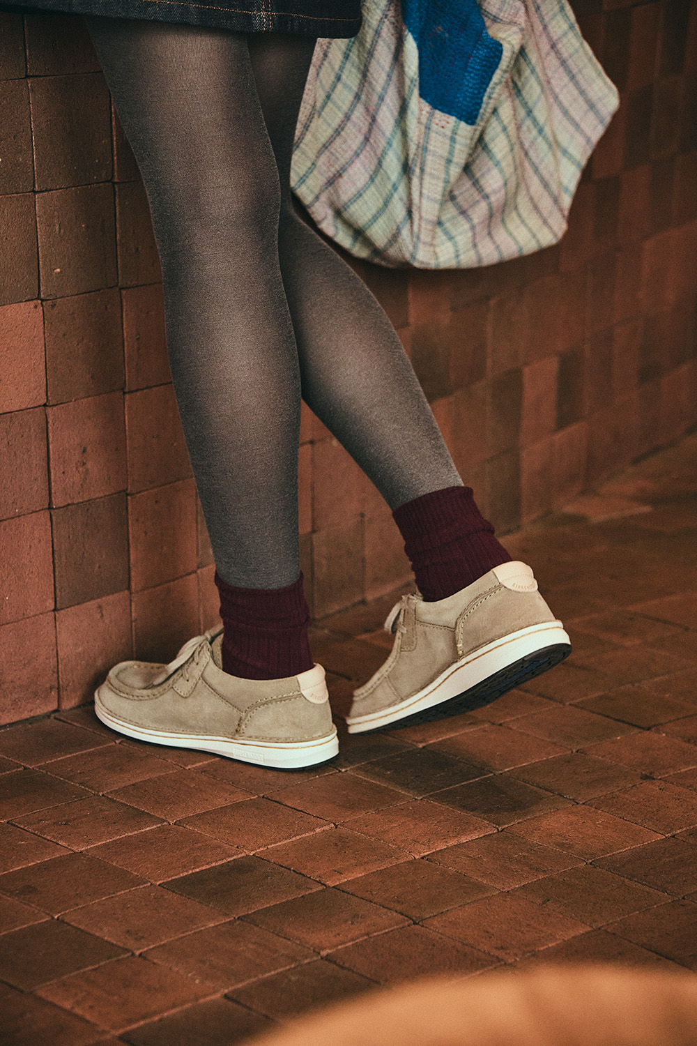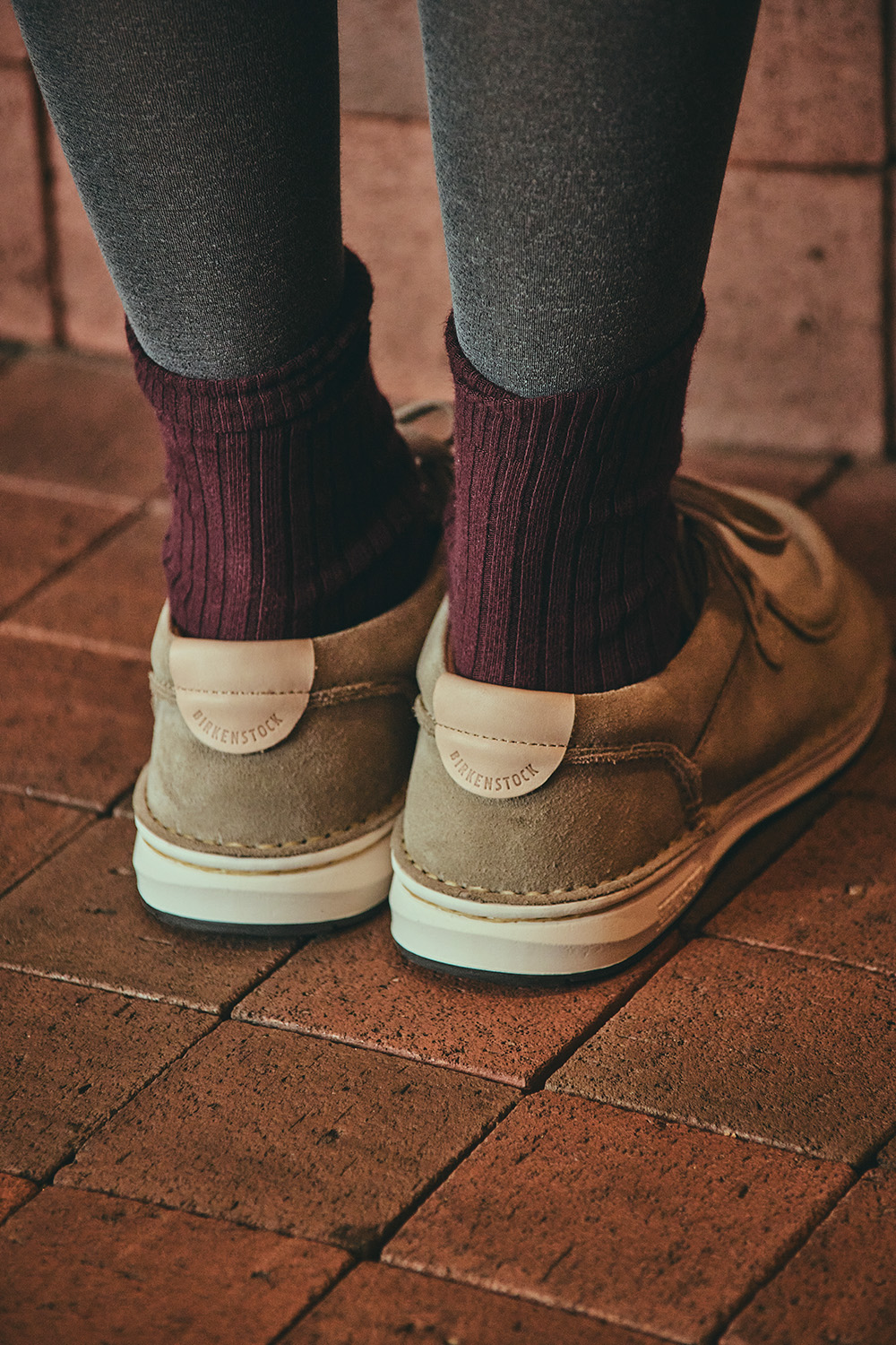 彼女が履いているのは、「ボストン」や「チューリッヒ」でお馴染みのカラーリングであるトープ。上品なスエードとバーガンディの靴下とのコンビネーションも素敵だな。僕のはバサルトグレイというカラーだけど、どんなパンツとも相性の良いルックスに、足を包み込む気持ちのいいフィッティングを兼ね備えたこの靴の素晴らしさを知ったら、つい、色違いで揃えたくなってくる。