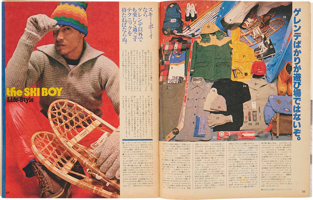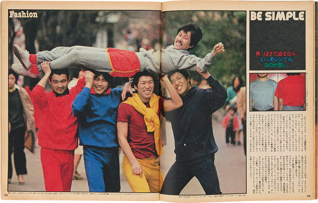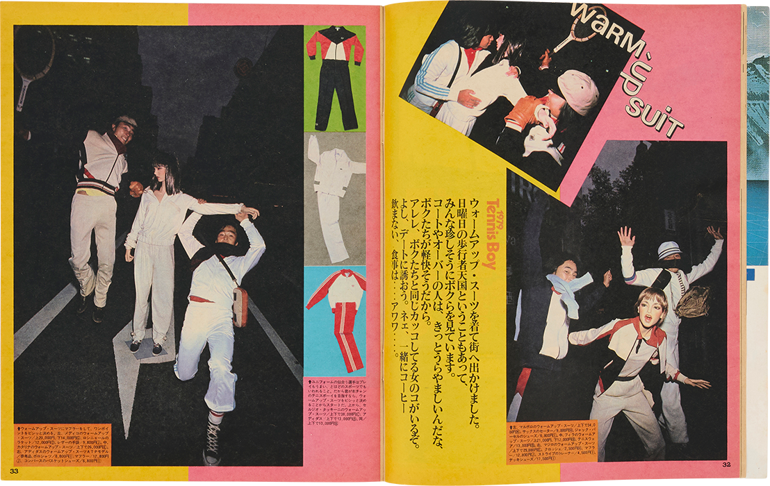 同誌は以後も77年~80年初頭にかけ、サーフボーイ、テニスボーイ、スキーボーイなんてタイトルで別冊を次々に発売。60年代からアイビーファッションを打ち出していた『MEN’S CLUB』でも70年代後半にはアスレチックなスタイリングが度々カバーを飾り、特集を組んだ。『Fine』や『JJ』といった女性誌もテニス、サーフィン、スキー推し。アウトドア派な雑誌は増すばかりで、お馴染み『BE-PAL』なんかもこの頃に誕生した。ファッション誌だけでなく『少年ジャンプ』でも漫画「テニスボーイ」が人気となり、ワーゲンバスとサーファーのイラストがカバーになっていたほど。世間のアスレチック志向が非常に強かったことが容易に汲み取れる。