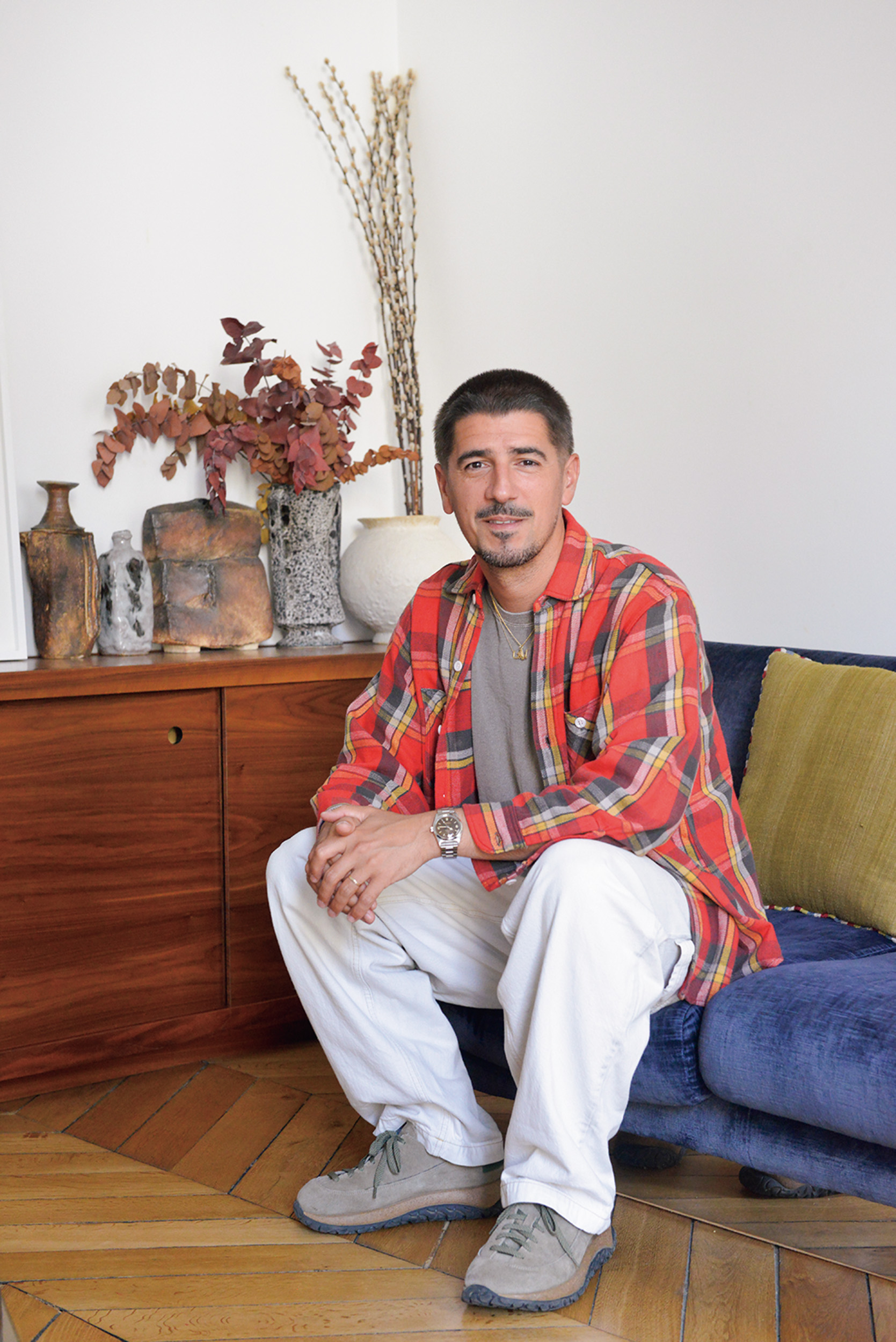 「スタンダードとは毎日を輝かせてくれるものだと思う。僕がインスピレーションを感じるのは、まずパリにある日本人の友人が営む『ドリーミンマン』のコーヒー。美味しいし、店のムードが大好きなんだ。そして朝起きて目に飛び込むキム・ミンジェの木の椅子。服も大事だよ。人生の瞬間を輝かせてくれるからね。特にシャツは定番で、ストライプやプレーン、いろんなものを持っていてレイヤードするのが好き。いずれも良い品質であることが欠かせないよ。あと陶器も大切。フランスの〈La Borne〉の’60年代の器はテクスチャが素晴らしい。陶器はインパーフェクションなところがいいね」