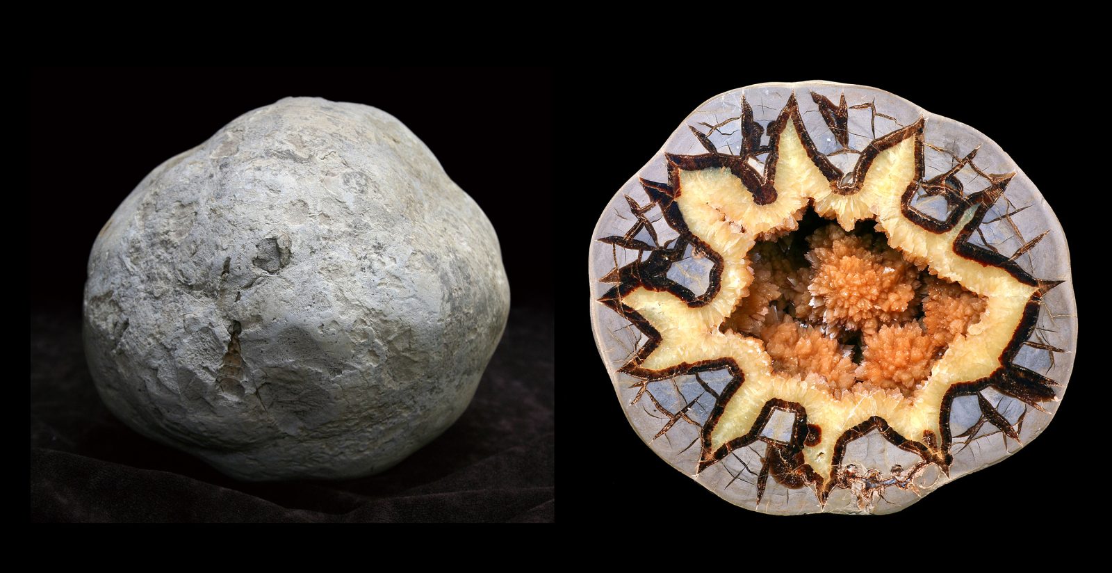 こうした石塊にはいろんなタイプがありますが、その中でも大きくなる過程で内部に網目状の亀裂と空洞ができ、そこに方解石や黄鉄鉱などの鉱物の結晶が成長したものがセプタリアです。