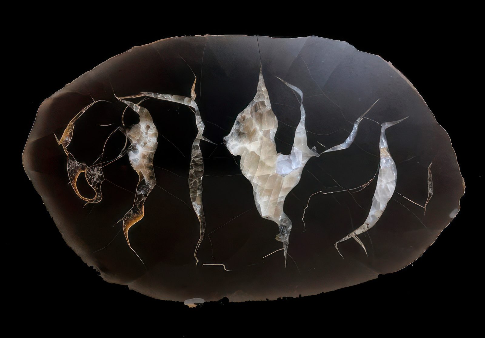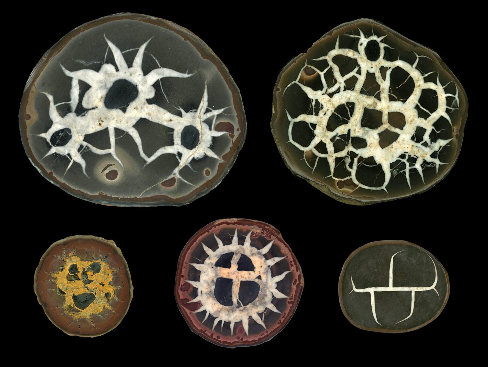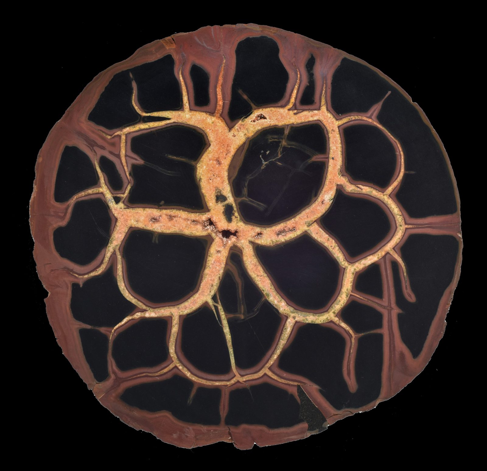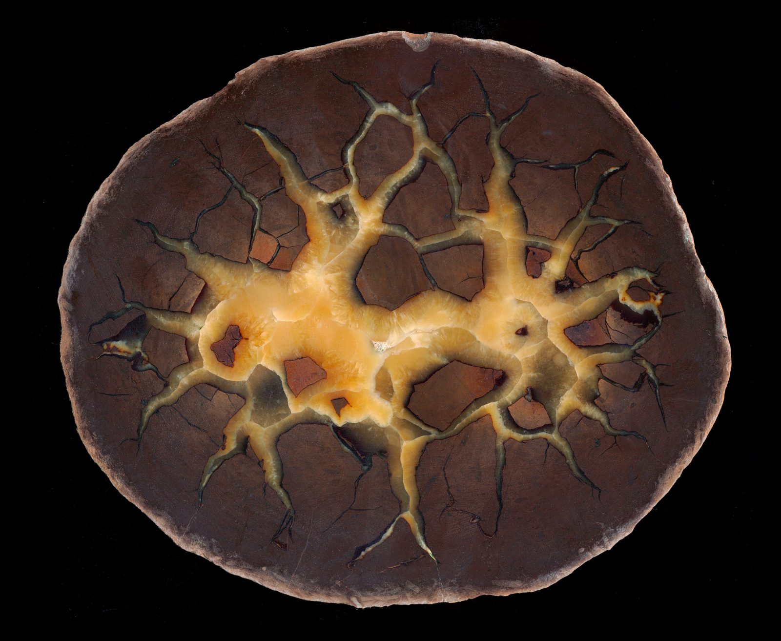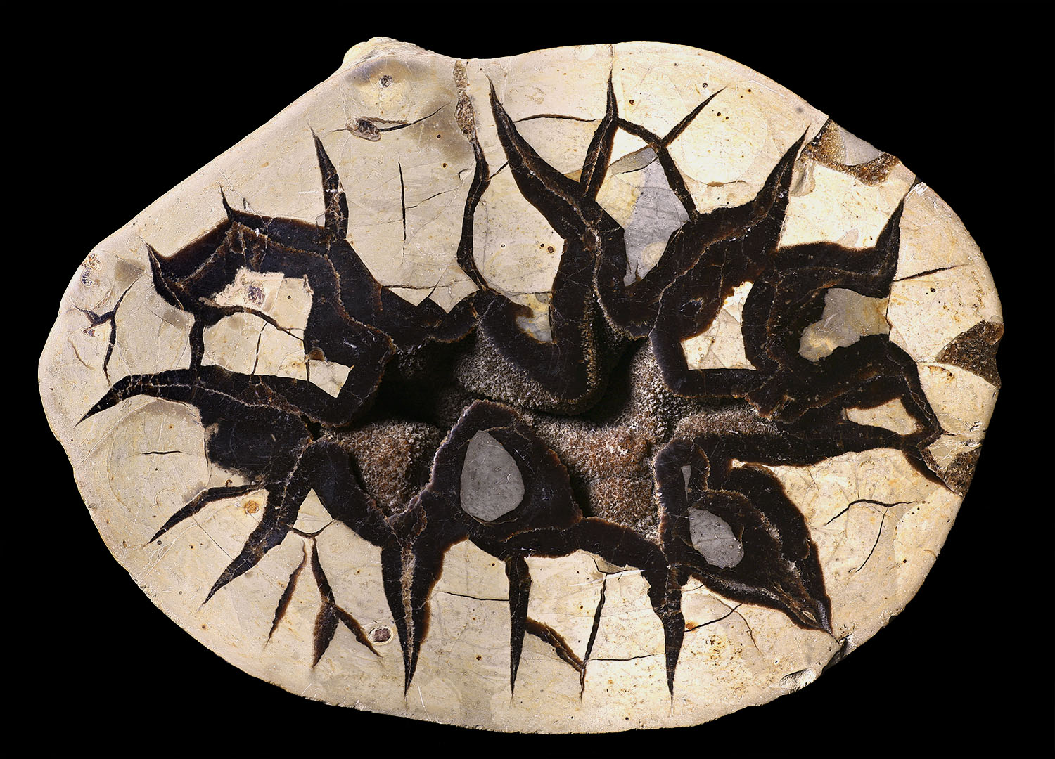 セプタリアは切ると独特な放射状の模様が現れます。土色・砂色の地味な外見からは想像できないような、方解石やあられ石の結晶が詰まった、驚くほど派手な模様が現れるものがあります。こうしたものは「ドラゴンの卵」などと呼ばれ、鑑賞石、飾り物としても売られてきました。アメリカ・ユタ州南部産、マダガスカル島産のものは先端の尖った放射状の模様が入っていて、「ドラゴンの卵」と呼ぶにふさわしい姿です。