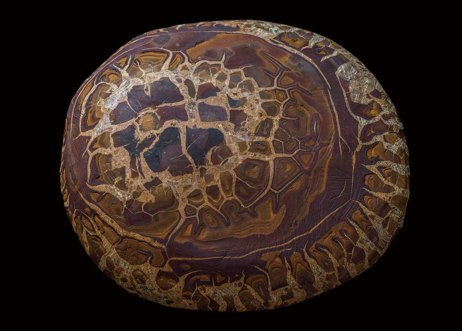 聞き慣れない名前と思いますが、世界各地で採れるもので、日本でも埼玉県小鹿野町、群馬県上野村、北海道富良野市などに産地があります。石の球が風化して表面が削れ、中の網目状の構造が表に出てくると、これが亀の甲羅のように見えるというので、日本では亀甲石と呼ばれてきました。
