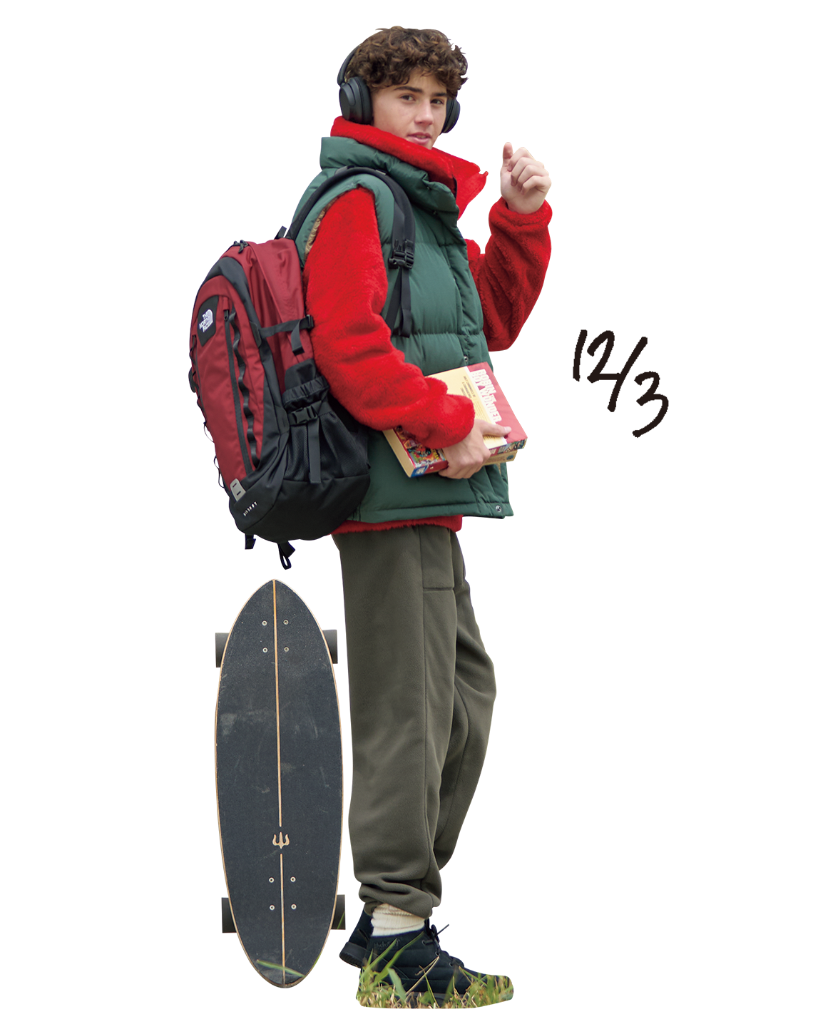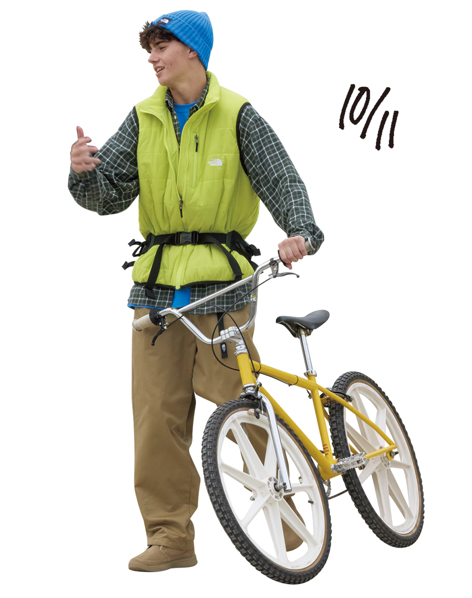 ヒートシーカーのライトライダーベスト¥24,200、ボタンダウンのフロストフォージフランネルシャツ¥19,800、フリーライドスクエアロゴティー¥6,050、ロックステディチノパンツ¥19,800、ハイドロシールのヌプシチャッカウォータープルーフ2スウェード¥23,980、カプッチョリッド¥4,730、リサイクルナイロンのクライマーランバー〈9L〉¥12,100 その他は私物