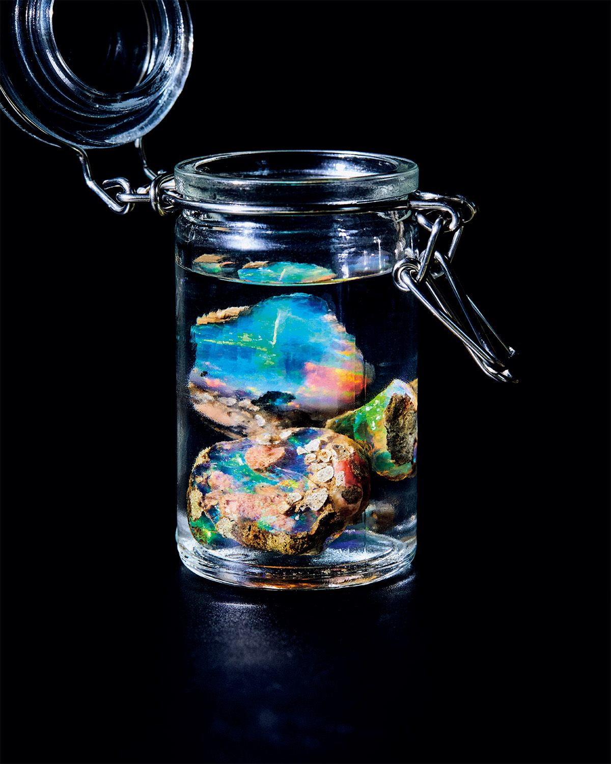 エチオピアは最新のオパールの産地。1994年に初めて発見され、2008年にウェロ州で大規模な鉱床が発見されて以来、世界の宝石市場で急速に注目を集めるようになった。それ以前はオーストラリア産が主流であったが、エチオピア産はまた独特の性質と美しさで新たな地位を築いている。このオパールの最大の特徴の一つが、高い水分含有率である。これによりガラスのような非常に高い透明度を誇る。そのため、標本として保存する際には、水を満たしたガラス瓶や透明な容器に浸して管理し、乾燥による亀裂や変質を防ぐことがある。ボトルの中で水に沈む宝石を観賞する、というユニークな標本だ。また、オパール特有の「遊色効果」も顕著で、透明な地色の中に、赤・緑・青・オレンジなどの輝きが虹のように浮かび上がる。これはオパール内部の微細なシリカ球が光を回折させることで生じる現象であり、見る角度や光源によって色彩が変化する。特に透明度の高いエチオピア産は、この遊色が立体的で奥行きを感じさせ、非常に魅力的だ。