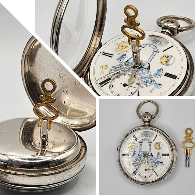 フリーメイソンのアンティークの懐中時計。ケースは銀無垢で、1864年製造の鎖引き式。付属のKEYを差し込んでゼンマイを巻きます。