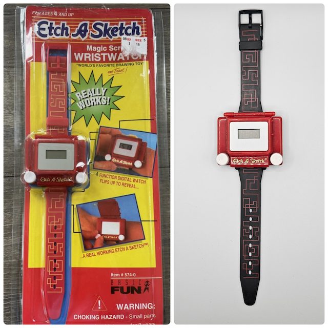 一度は子供の頃にやったETCH A SKETCHの腕時計。時計の蓋を開けると、なんと実際に遊べてしまう優れものです。