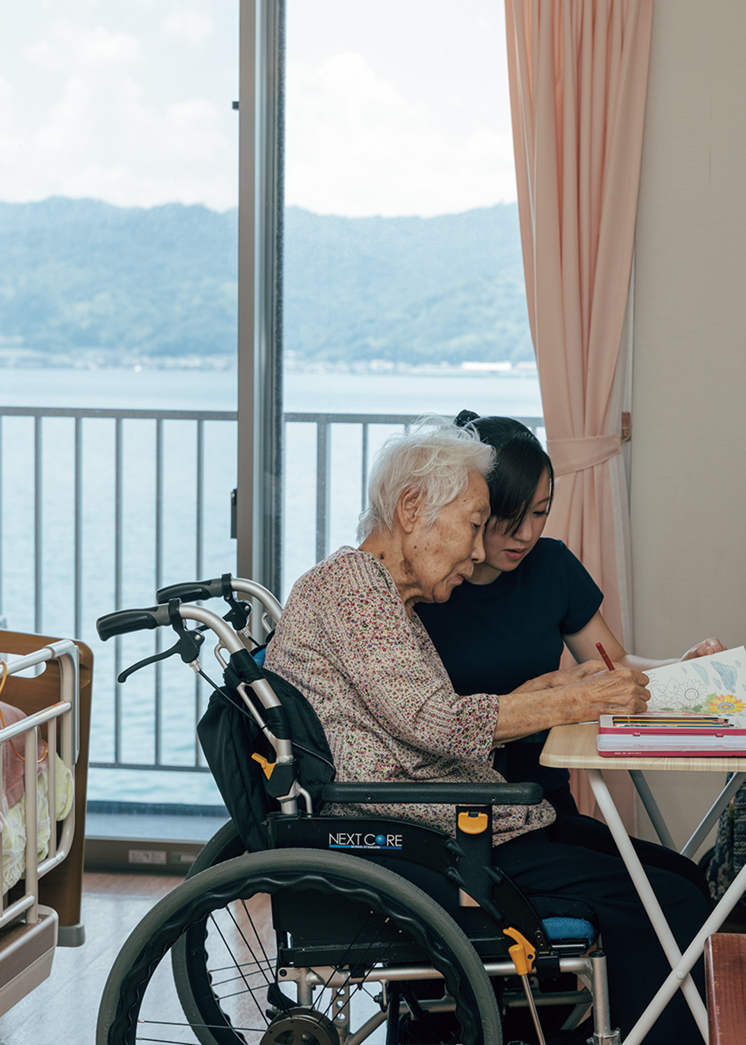 「マ・ルート」の眼前には宮津湾。近くに天橋立がある風光明媚な環境だ。湾に面した個室も多く、1階のカフェからも広大な景色が見え、閉塞感が全くない。夏の花火大会には、空いっぱいに広がる花火を見に利用者の家族が訪れ賑やかな一日になるそう。そもそも利用者の大半が宮津出身者だから、家族が訪ねてくることはしょっちゅう。でも地域密着型の「マ・ルート」では、迎えるだけでなく、利用者たちと地元を訪れるツアーも開催している。