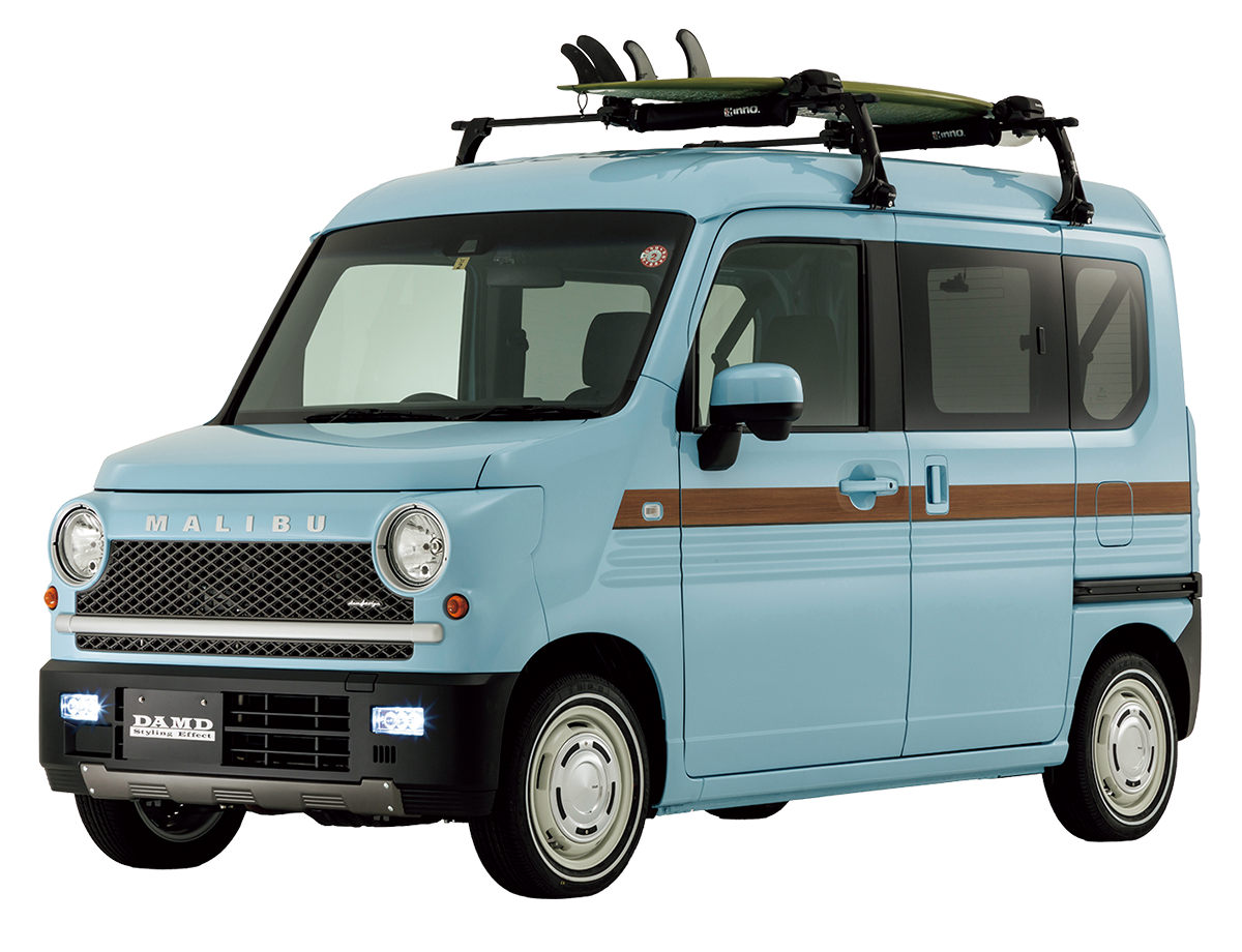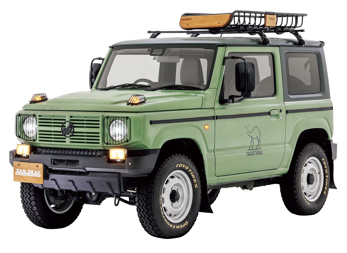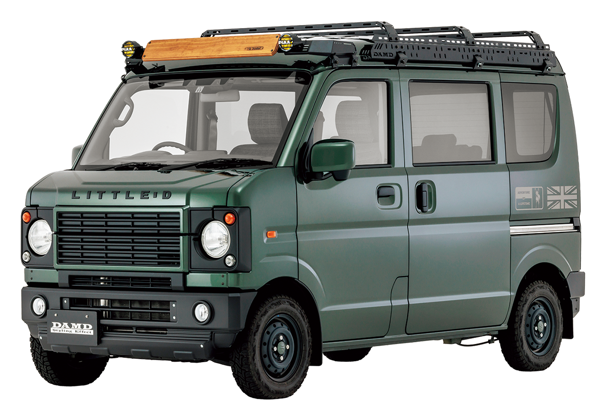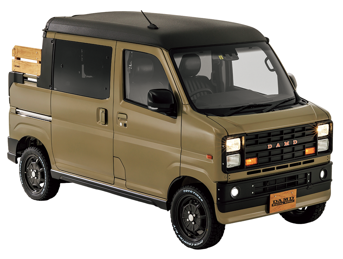 ベースは〈スズキ〉の「エブリイ」で、商用車としても人気の軽バンが〈ダムド〉によってクラシカルなSUVの容姿へ。カスタムのモチーフは〈ランドローバー〉の「ディフェンダー」だ。英国で軍用にも採用されたこのクロスカントリーの名車が「日本特有の“軽”になったら?」という発想から生まれた一台で、LD25型など1983年以降に登場したモデルの象徴的なルーバーグリルのデザインが武骨さを漂わせ、一方で丸目に換装したヘッドランプによってその顔は愛嬌さえもあわせ持つ。広い荷室とスクエアな造形はギアを積みやすい。これに乗れば週末のキャンプはワクワクだね。