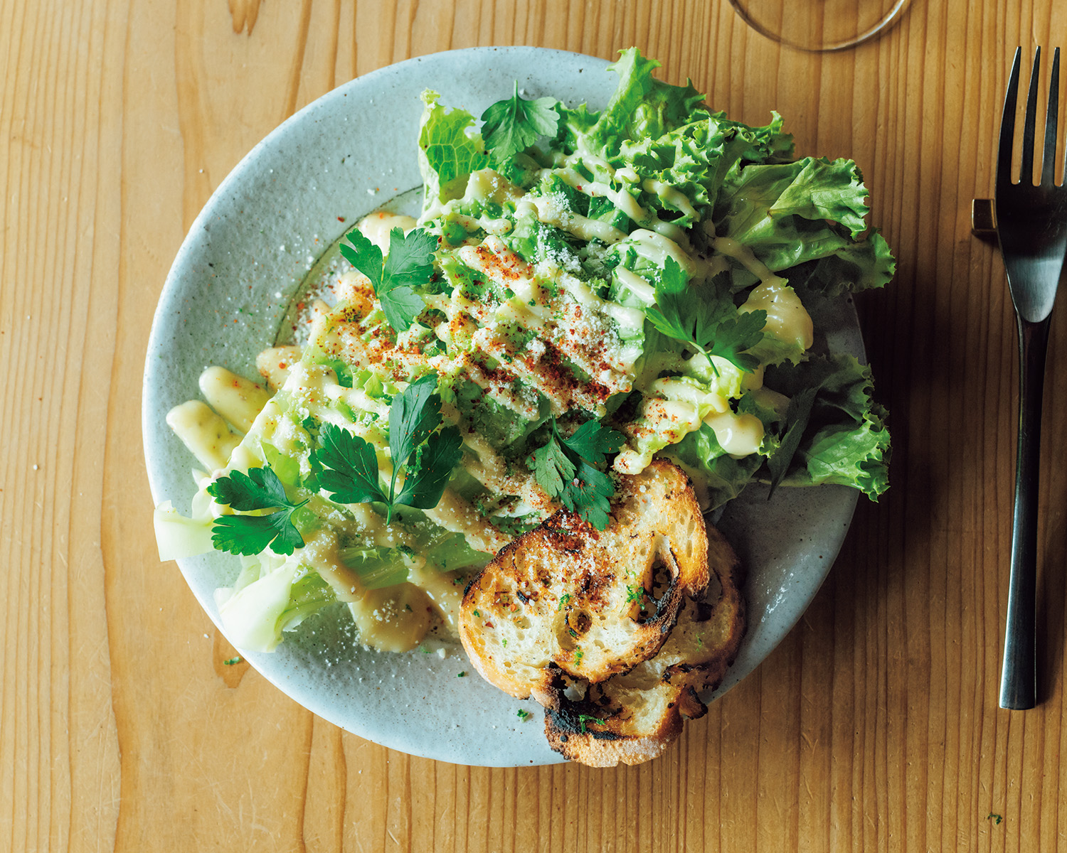 ドレッシングをラフに絞り、パセリやチリパウダーを散らした、見た目にも洒落た一皿。ステーキさながらにナイフとフォークでどうぞ。結球の内外で異なる食感が一緒に口にやってきて、抜群の満足感。カリカリのバゲットもアクセントに。