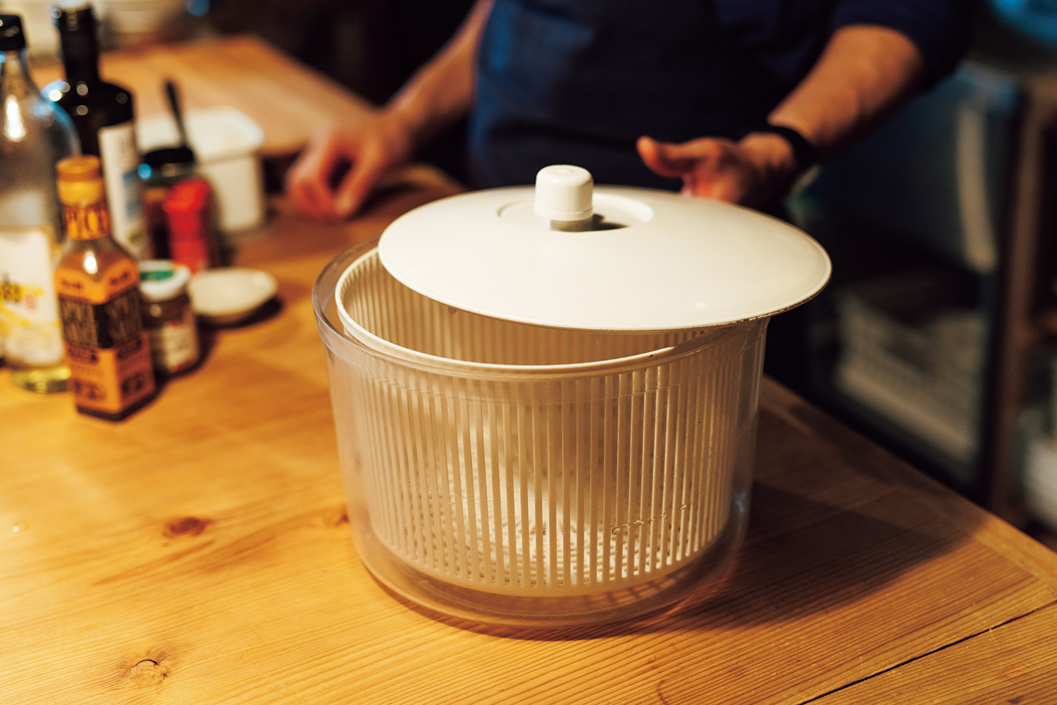氷水に漬けたレタスは、ドレッシングをかける前にしっかり水切りを。「手ぬぐいに包んで振り回すのもひとつの手。でもサラダスピナーがおすすめです」という原川さんは合羽橋で購入。2000円ほどから手に入る。