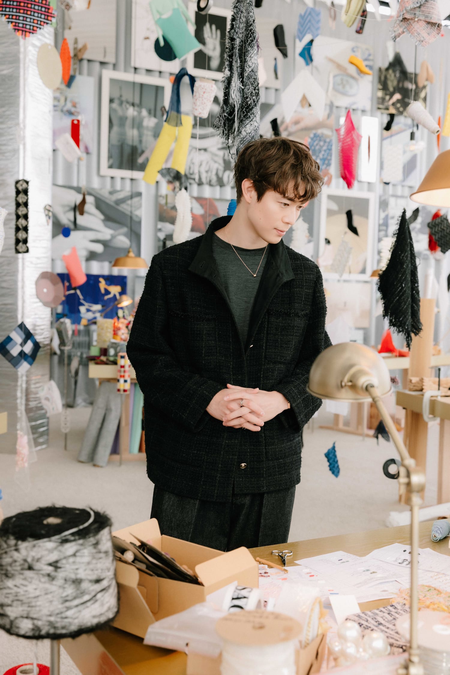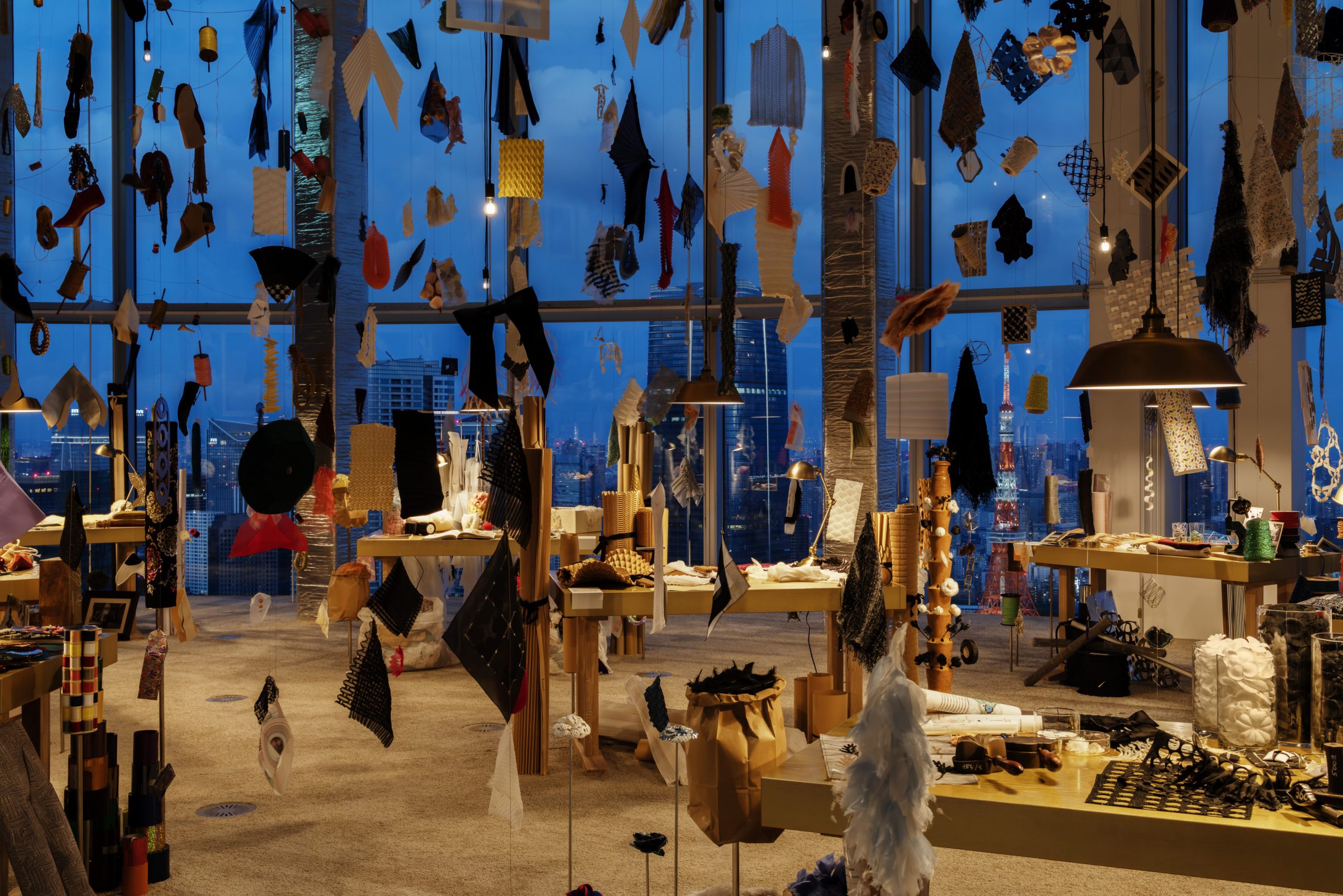 3章構成の本展。最初に来場者を迎えるのが『le Festival』。建築家・田根剛氏率いる「ATTA」によるインスタレーションだ。窓の外に映る東京の眺望を背景に、床、テーブル、はたまた天井から吊るされ広がるサンプルや材料や道具……。一面に広がるモノたちで、展覧会を祝福するかのような祝祭的空間が構成される。