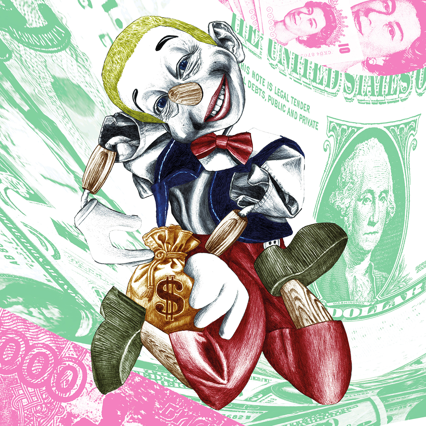 For the artwork, I asked my friend Peter Harris, who is a really good visual artist, to draw a crumpled Pinocchio puppet clutching some money. I wanted it to look a bit like the bastard love child of Elon Musk and Mark Zuckerberg.