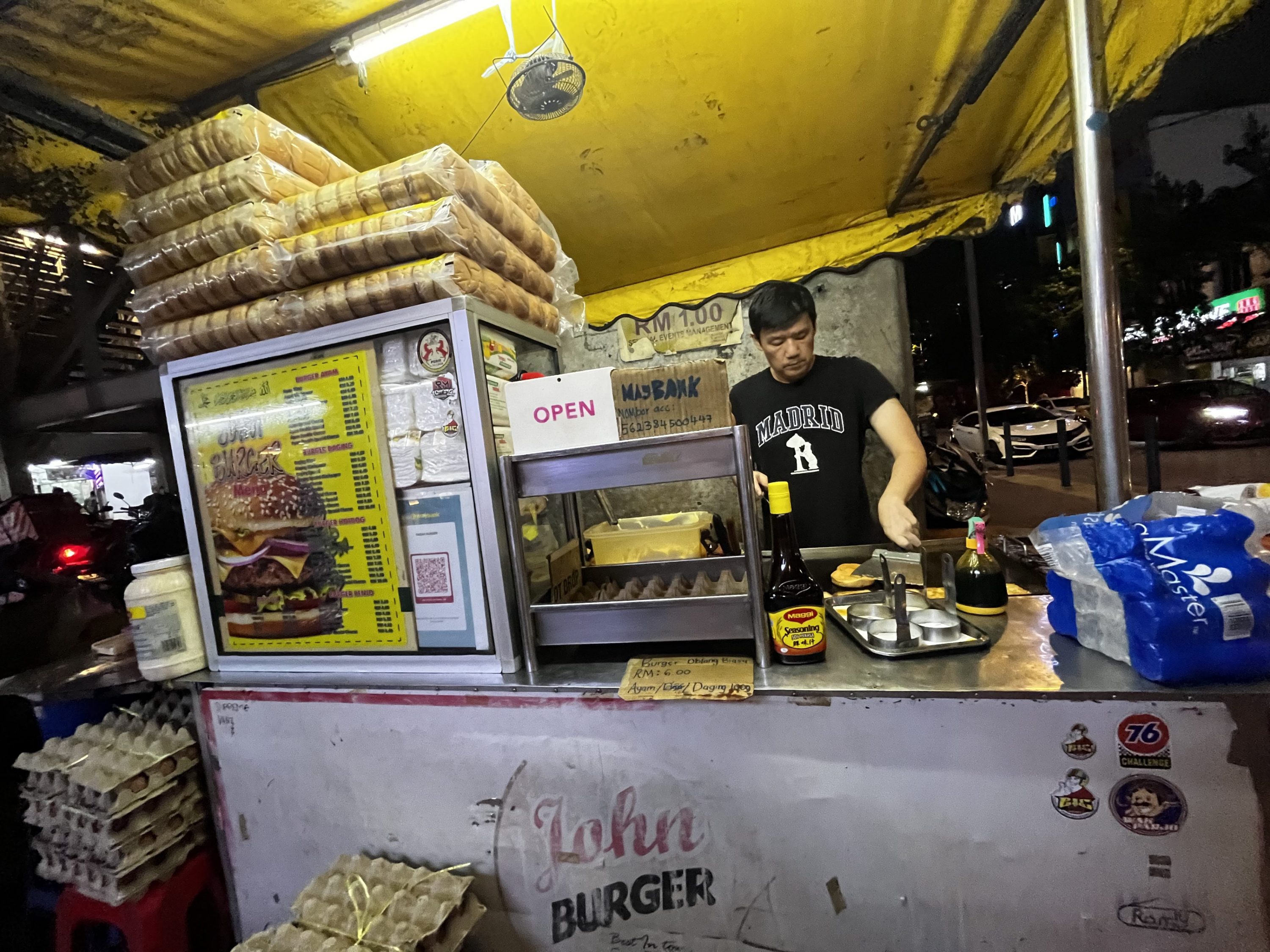 夕方から夜の時間帯に様々な場所で屋台で販売されるハンバーガーなんですが、屋台の場所が決まっていないんですよ。つまりラムリーを求めて歩き回って出会うしかないんです。「オフラインラブ」より難しい。配車アプリGrabでどこにでもすぐに車が呼べて信じられないくらい安い超快適マレーシアですが、屋台を探すときはピンを立てようがないですからね。歩くしかない。もちろんほぼ毎日ここにはいるよ、的な場所もあるんですが、なかなかそこも頻繁自分が立ち寄る場所じゃなかったりして、まあ出会えた時の嬉しさが半端じゃないです。
