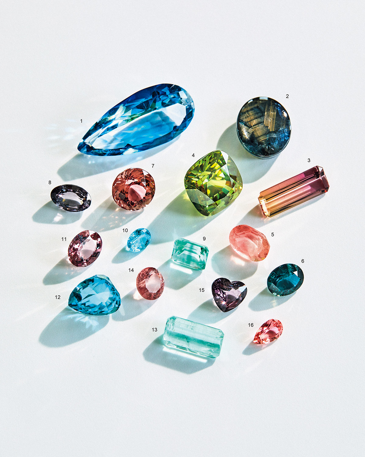 1. Bi-color Euclase、2. Gold Sheen Sapphire、3. Bi-color Imperial Topaz、4. Sphene、5. Pink Euclase、6. Laurentthomasite、7. Red Topaz、8. Taaffeite、9. Bi-color Emerald、10. Paraiba Tourmaline、11. Padparadscha Sapphire、12. Blue Zircon、13. Phosphophyllite、14. Rhodochrosite、15. Musgravite、16. Vayrynenite