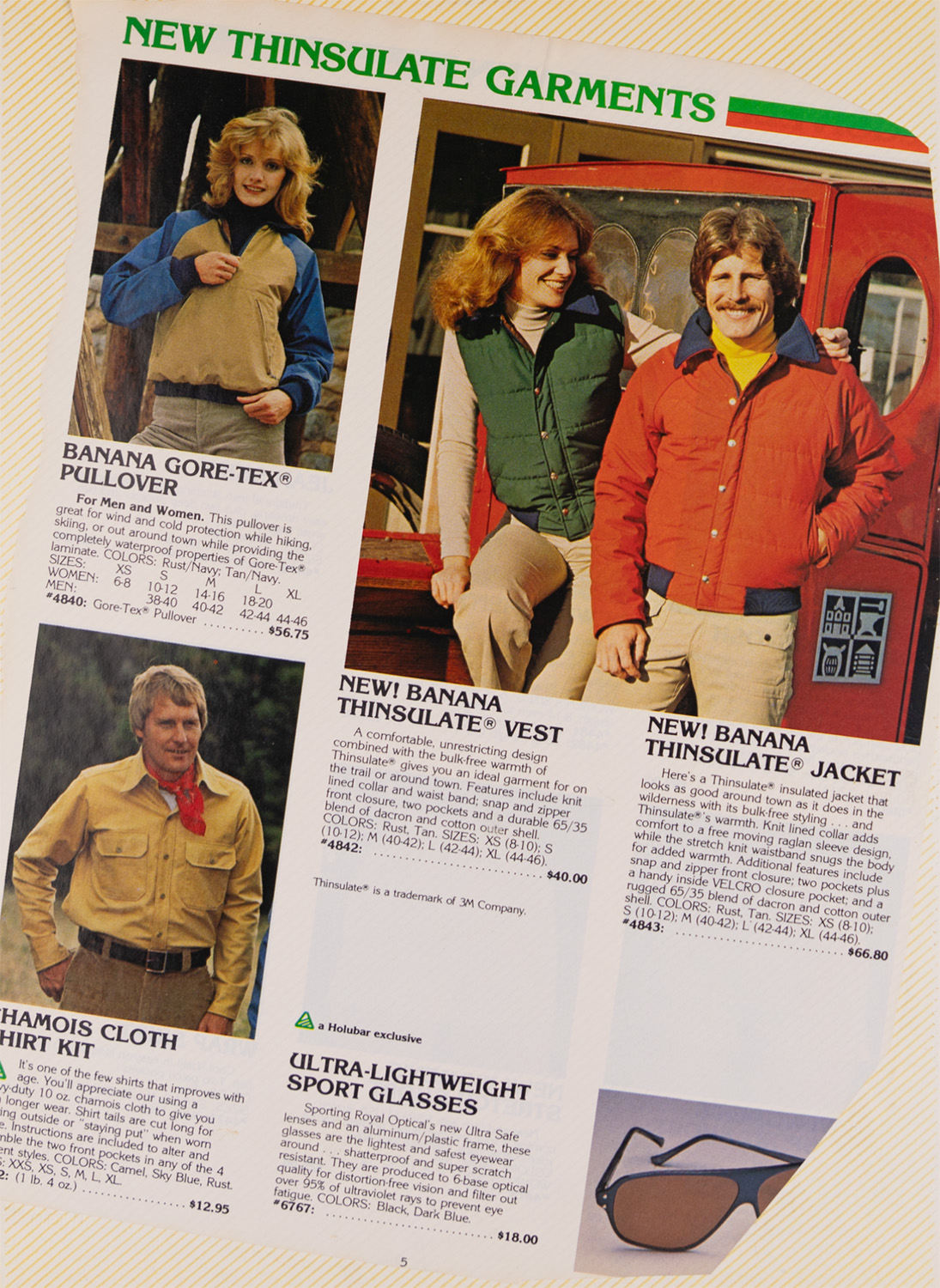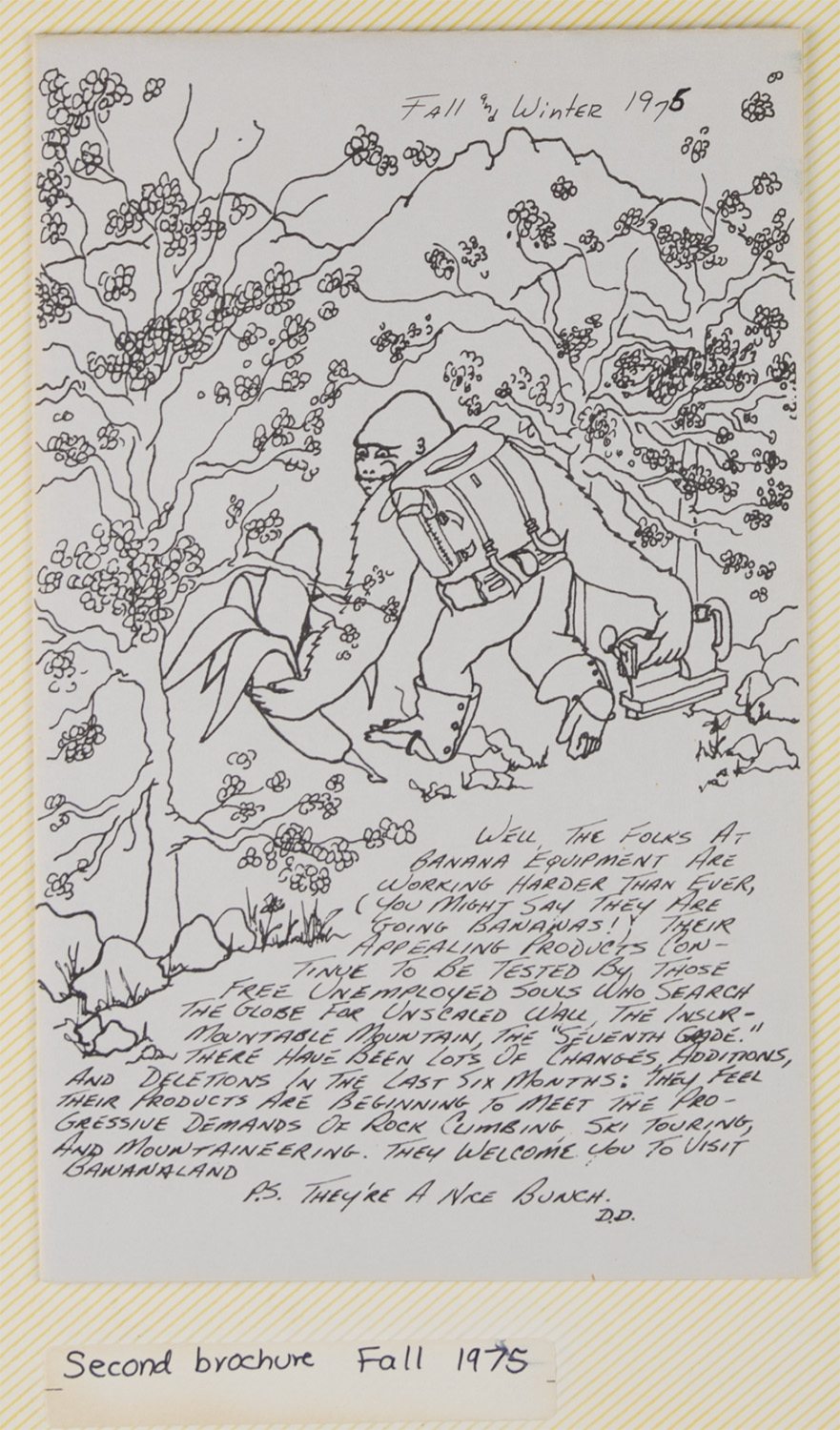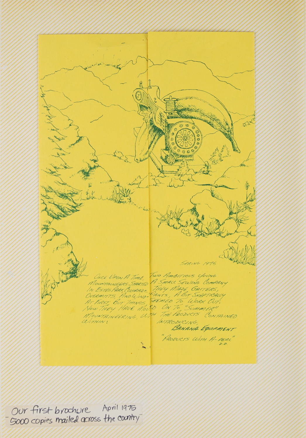 Heidenの好物にちなんで名づけられたBanana Equipmentは、1970年代のアウトドアブームを象徴する存在でもある。Banana Equipmentが発行した初めてのカタログは全国の小売店に郵送され、手描きのデザインを通じて、素朴で実直なスピリットを持つブランドとして名が知られた。1980年に会社が売却され、Chinook(チヌーク)として再出発を遂げるころには、従業員50名を抱える規模にまで成長し、エベレスト遠征隊に装備を提供するなど、アウトドアウェアの未来を押し広げる存在になっていた。