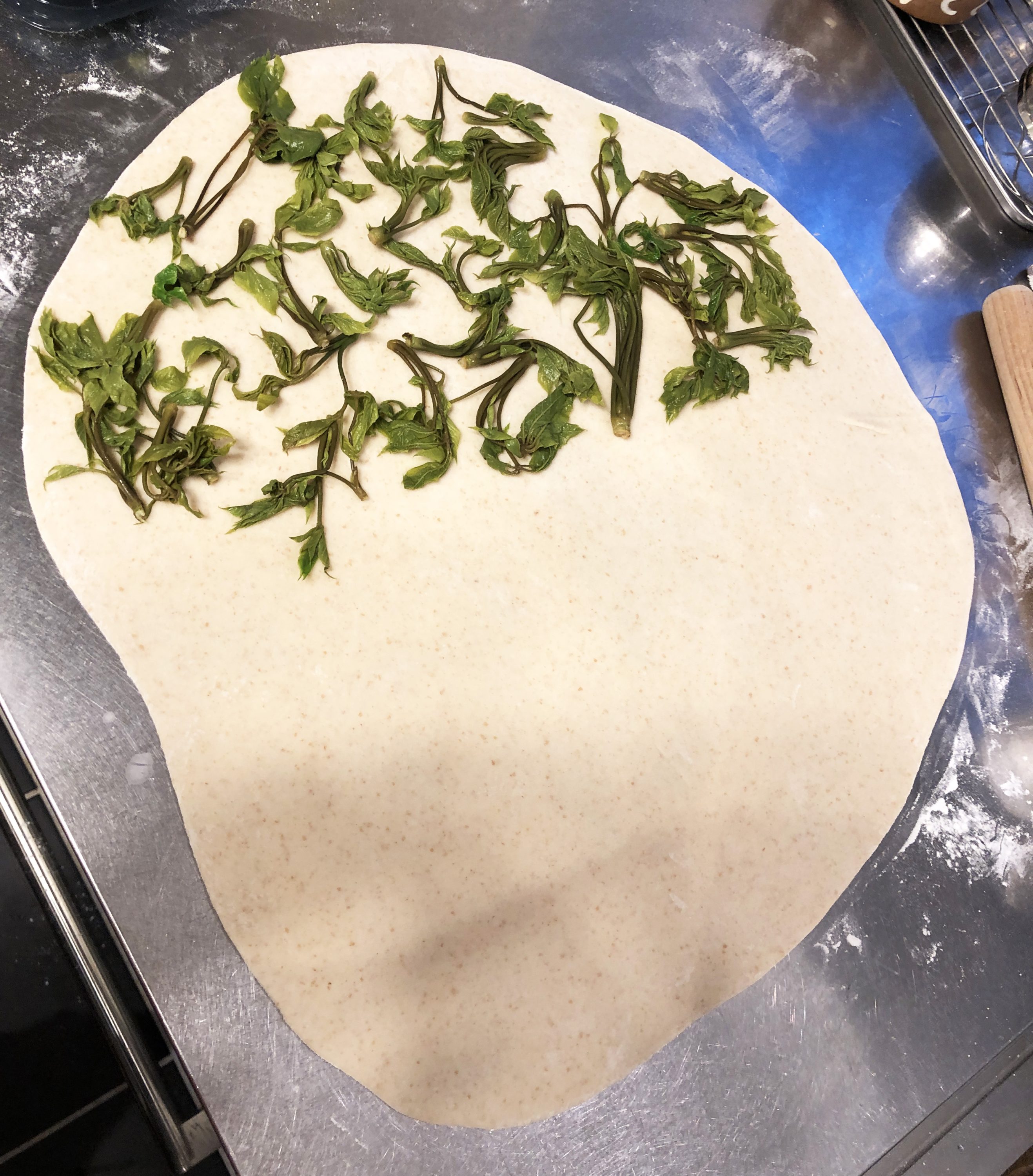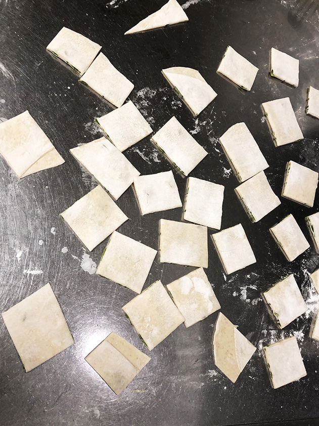 コシアブラを生地に挟み、ワンタンのような、ひもかわうどんのようなラビオリに仕立てる。