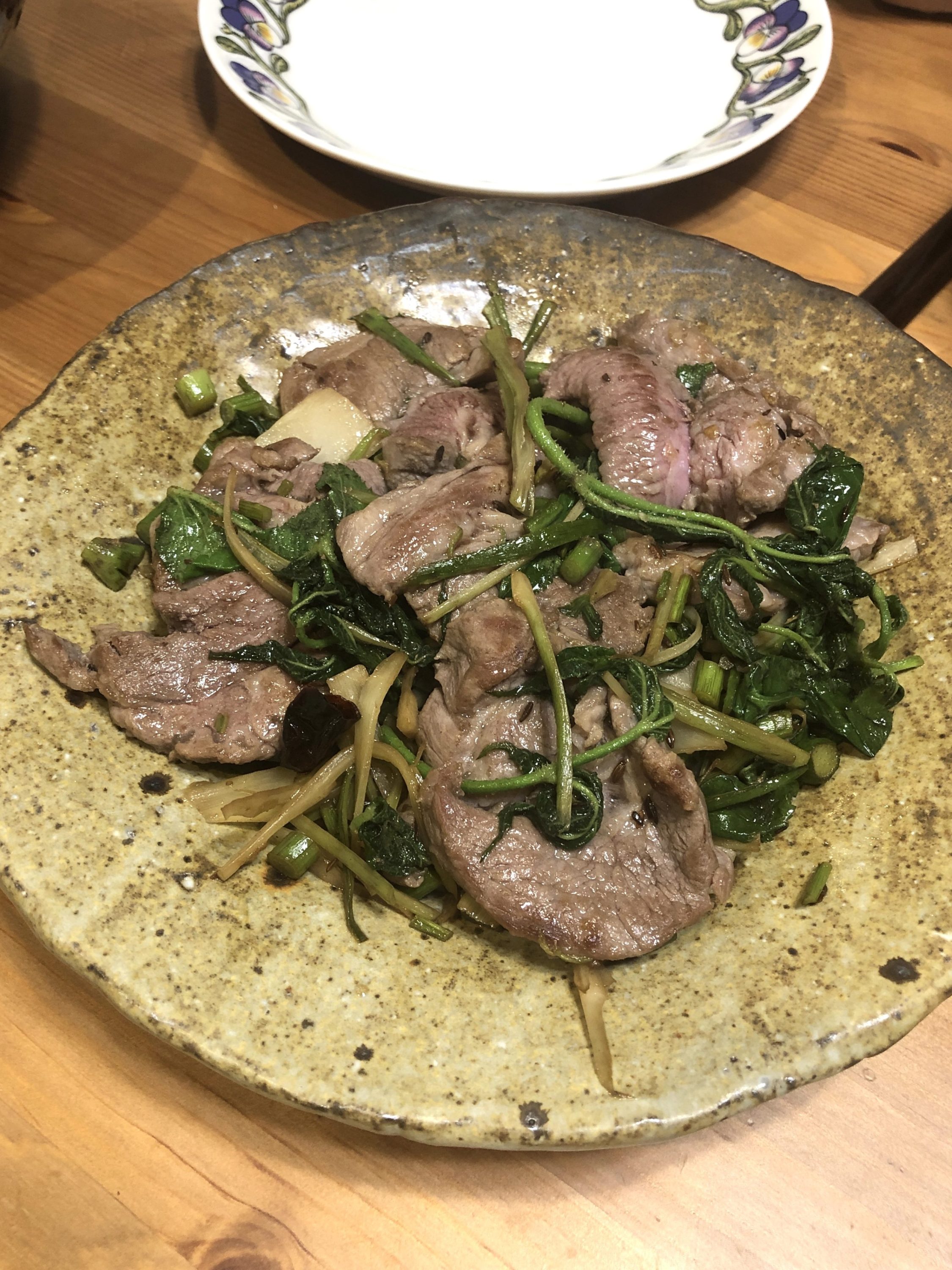 山うどをラム肉とクミンシードでさっと炒めて、ラムパクならぬ「ラムウド」に!