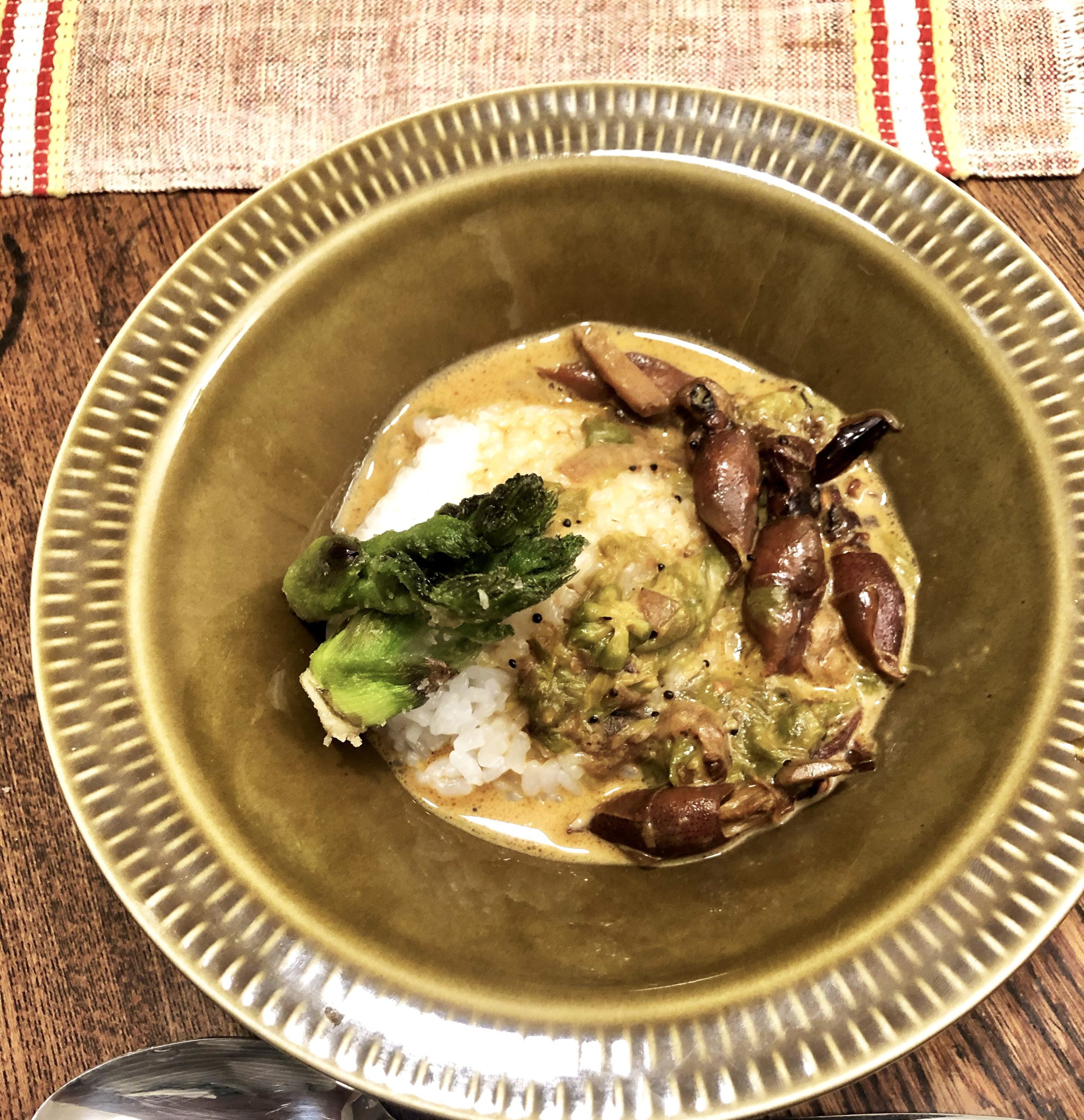 アク抜きしたふきのとうをマスタードカレーに。ココナッツの甘みとフェヌグリークの香りがふきのとうの苦味に合う。
