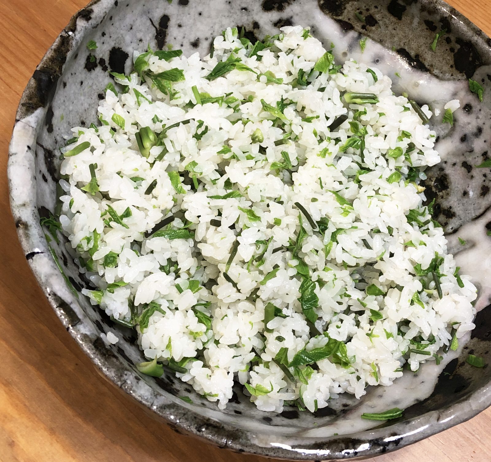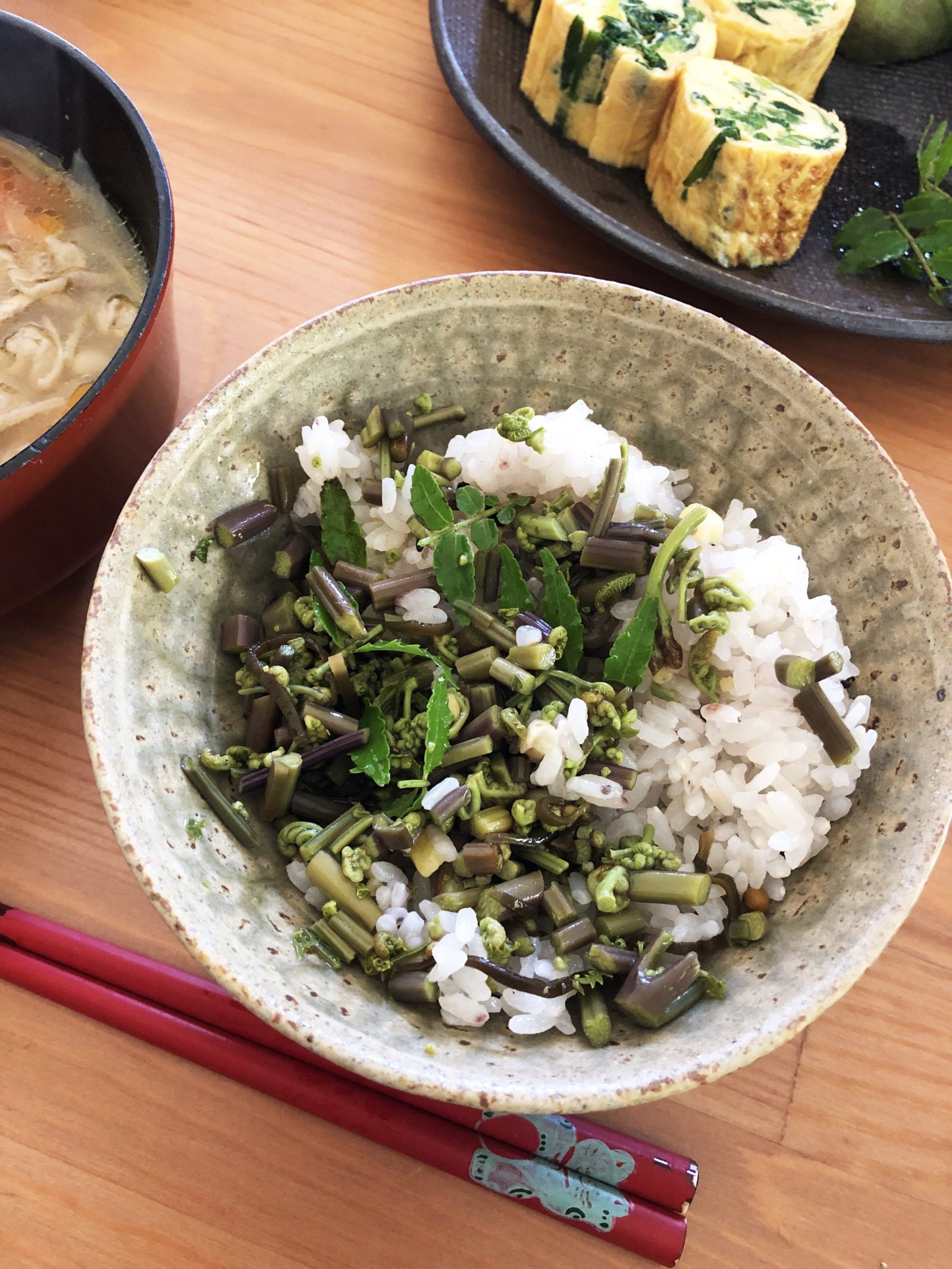 アク抜きしたワラビをざく切りにして、塩昆布と合えてなじませたものをごはんにのせて頂く。山椒の葉も一緒にのせると最高! 本場、山形のたたきわらびはトロトロになるまで叩くのだが、わたしはニュルシャキ感を味わいたいのでこの解像度で完成としている。