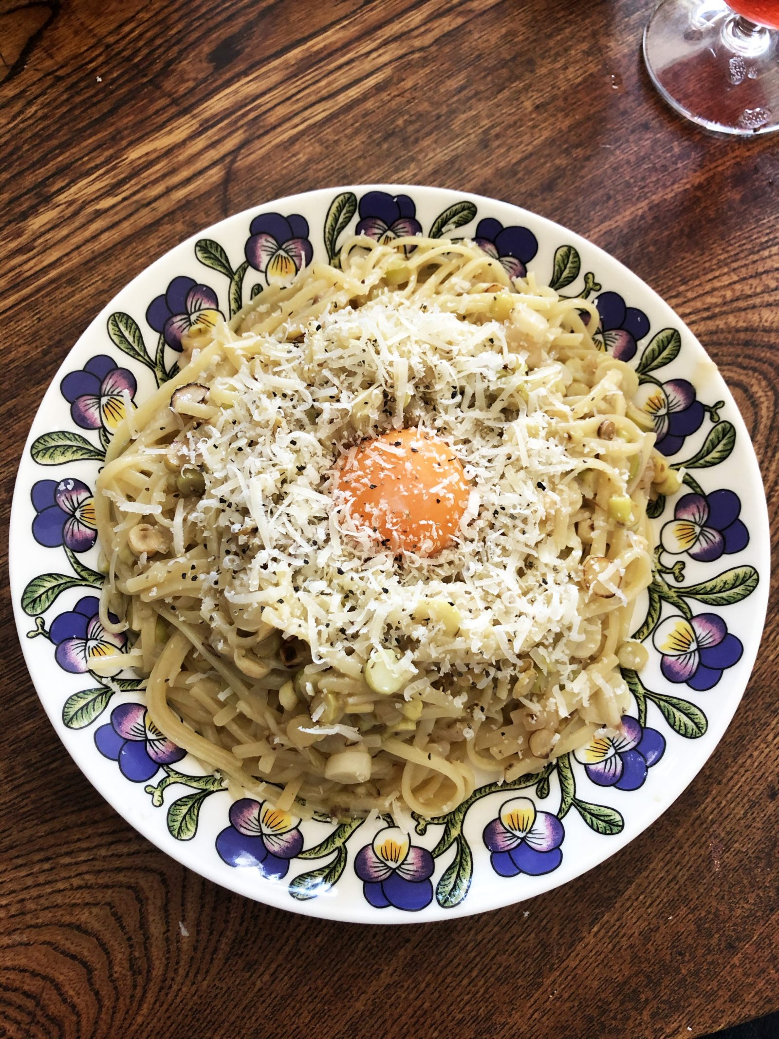 新玉ねぎをねっとり炒めたペーストで、こんがり焼いたすす竹の青臭さと香ばしさをまとめるパスタ。