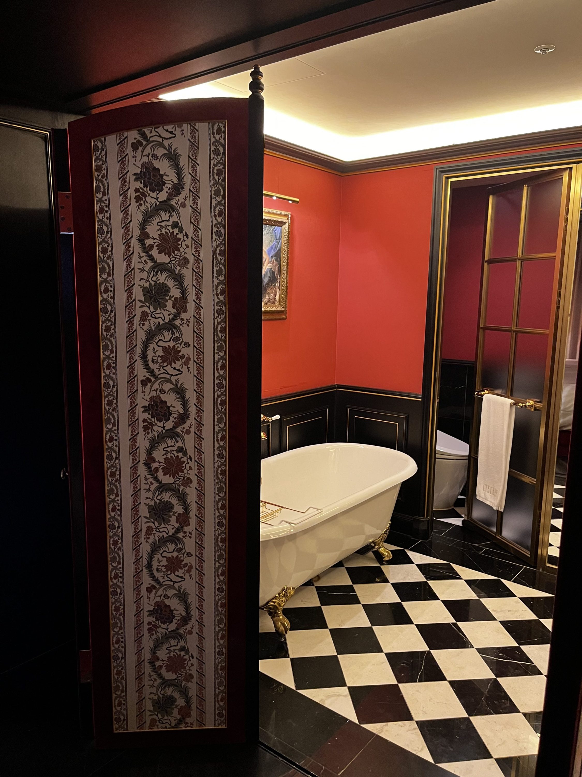 お風呂は「滑ったら危ないね!酔っ払っては入れないね!」って感じの作りではあるんですが、このように非日常を味わわせてくれるホテルの内装わたしはとっても好みです。