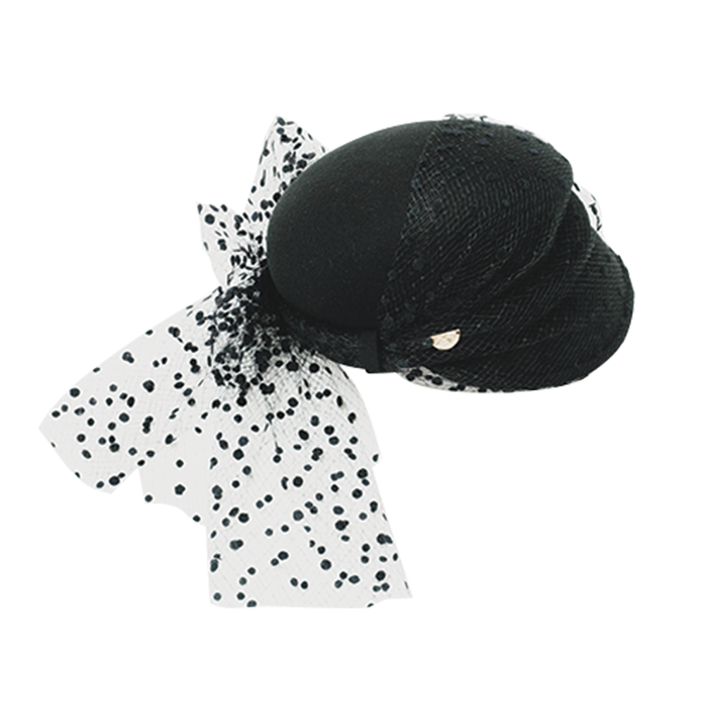 定番のアシンメトリーのキャスケットにエレガントなチュールリボンがついた限定のSP MAY TULLE(¥27,500)。リボンは取り外し可能で、シーンに合わせて2通りのスタイルを楽しめる。カラーは黒、ベージュ、ピンクの3色展開。