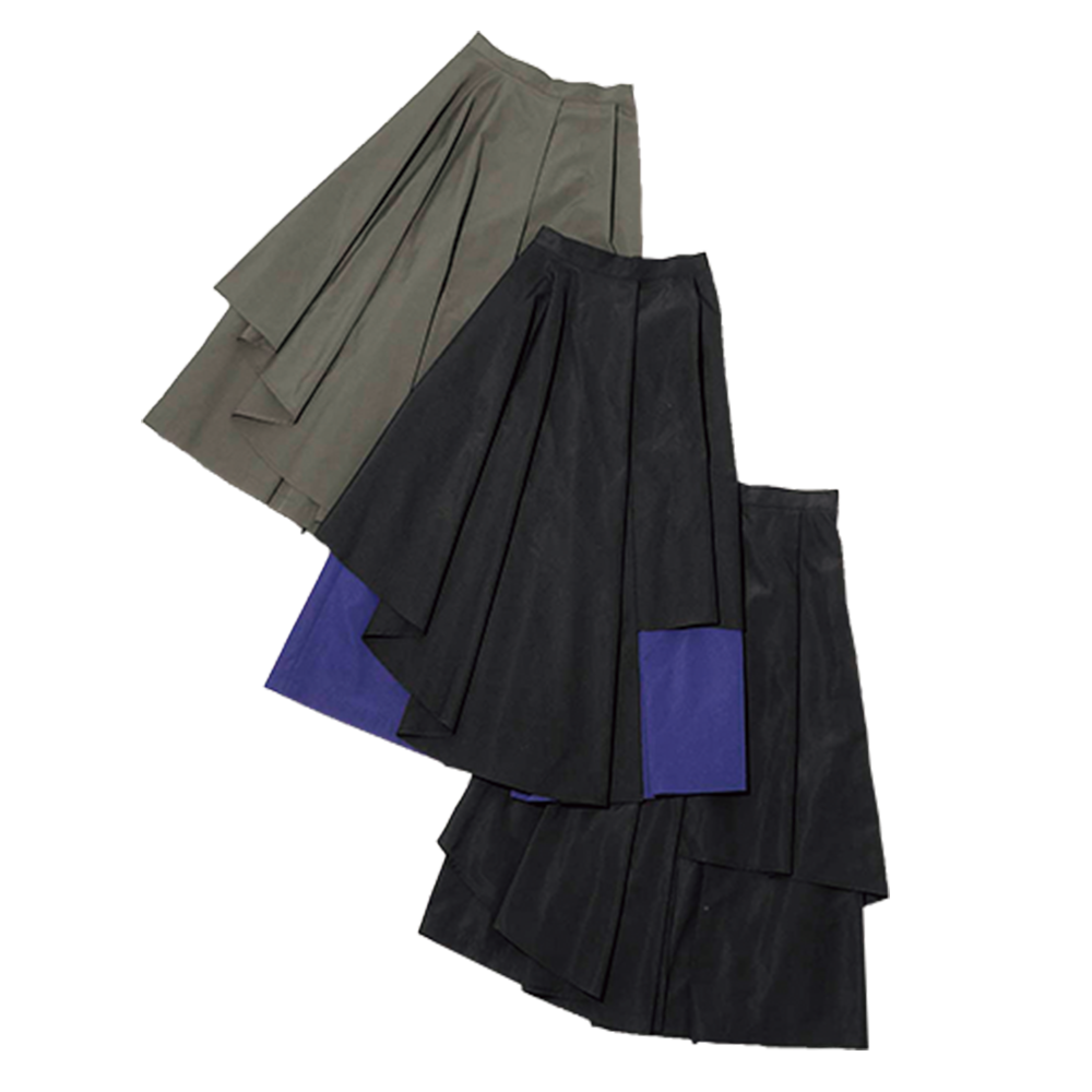 一見スカートのように見えるレイヤードデザインのワイドパンツ、ASYMME LAYERED PT(各¥30,800)に限定カラーが登場。ボリューム感のある美しいシルエットで合わせる服を選ばない。ブランドを代表する人気のアイテム。