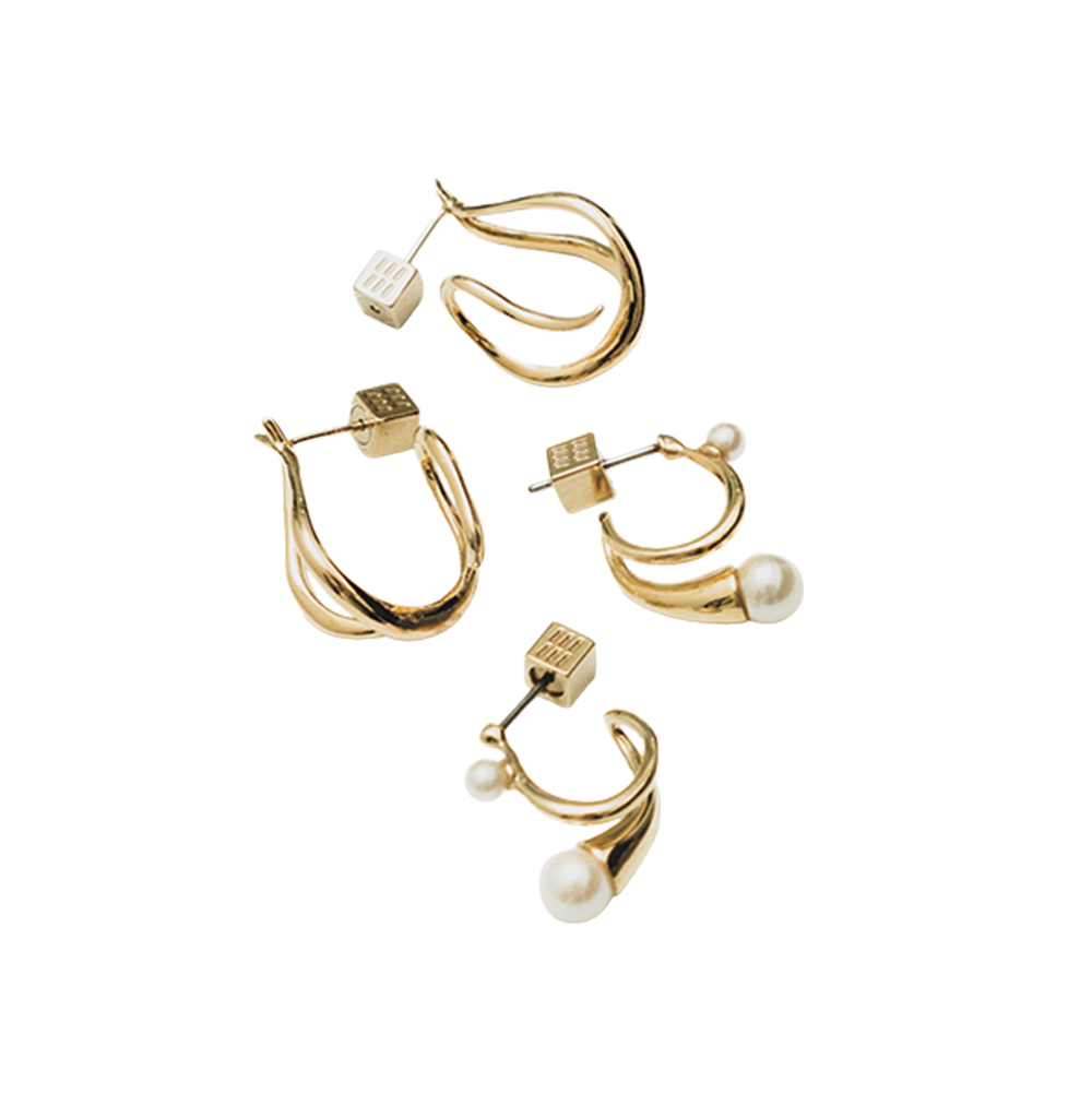 約3000種類のピアスやイヤリングを取り揃えるショップ。毎日使えるシンプルなデザインで、金属アレルギーを起こしにくい「ステンレスIP」を使っているのも魅力。ダブルラインピアス、ニュアンスパールピアス各¥4,730