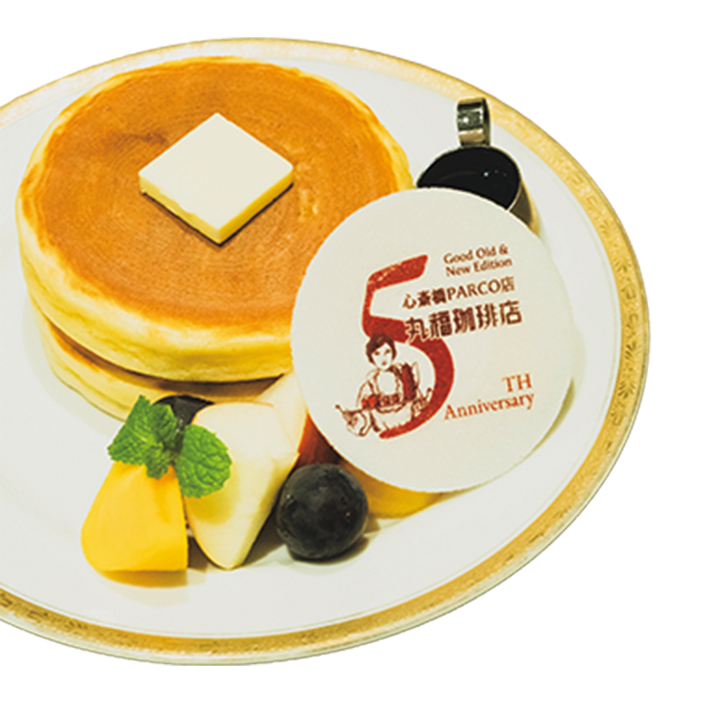 1934年に大阪で創業した喫茶店。分厚くてこんがり香ばしい名物のホットケーキに旬のフルーツを添えた5周年記念ホットケーキプレート(¥1,320)は買い物の合間にひと息つくのにぴったり。店内には書店とのコラボスペースも。
