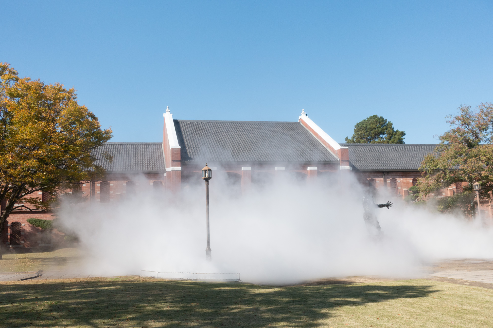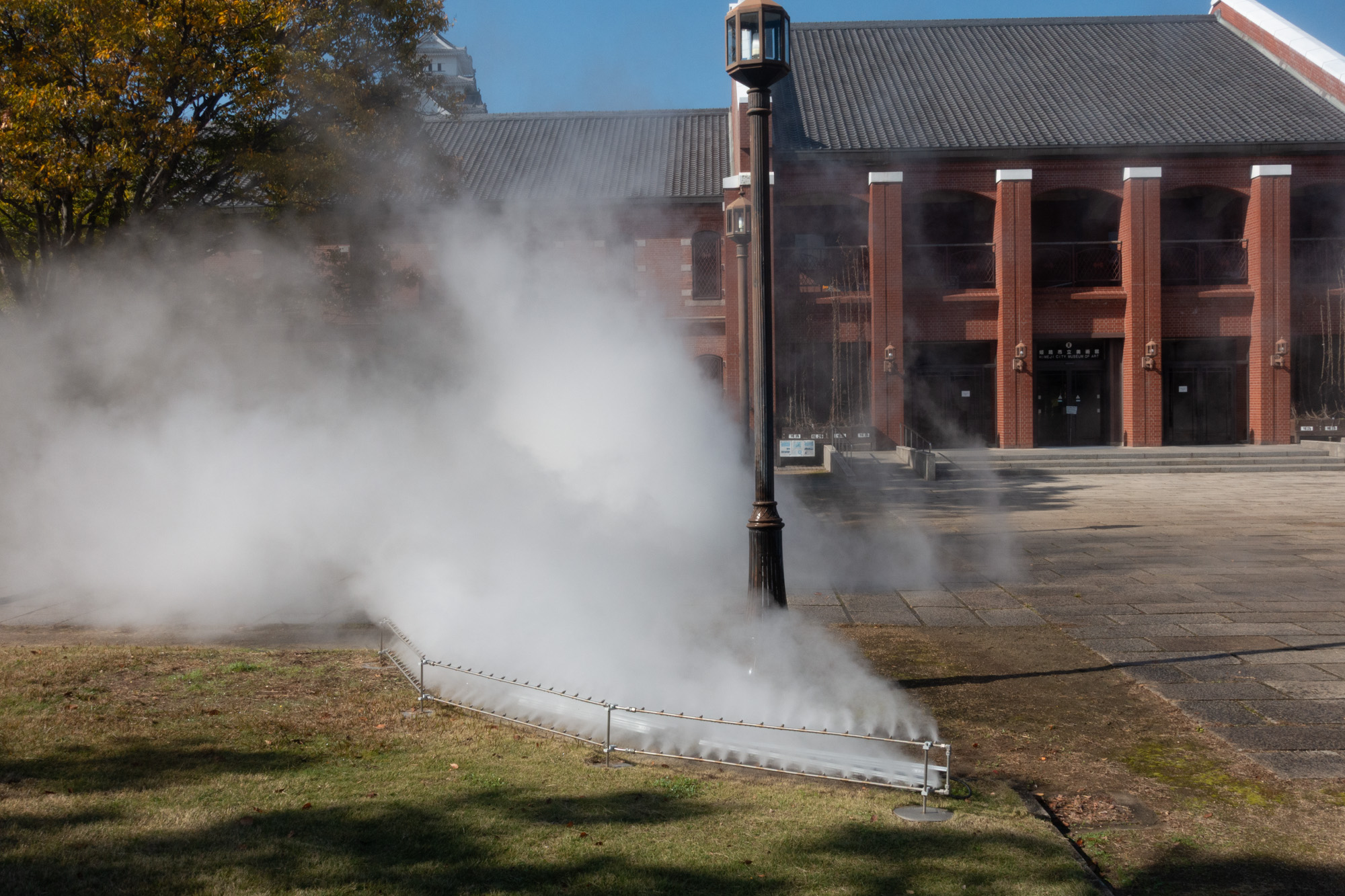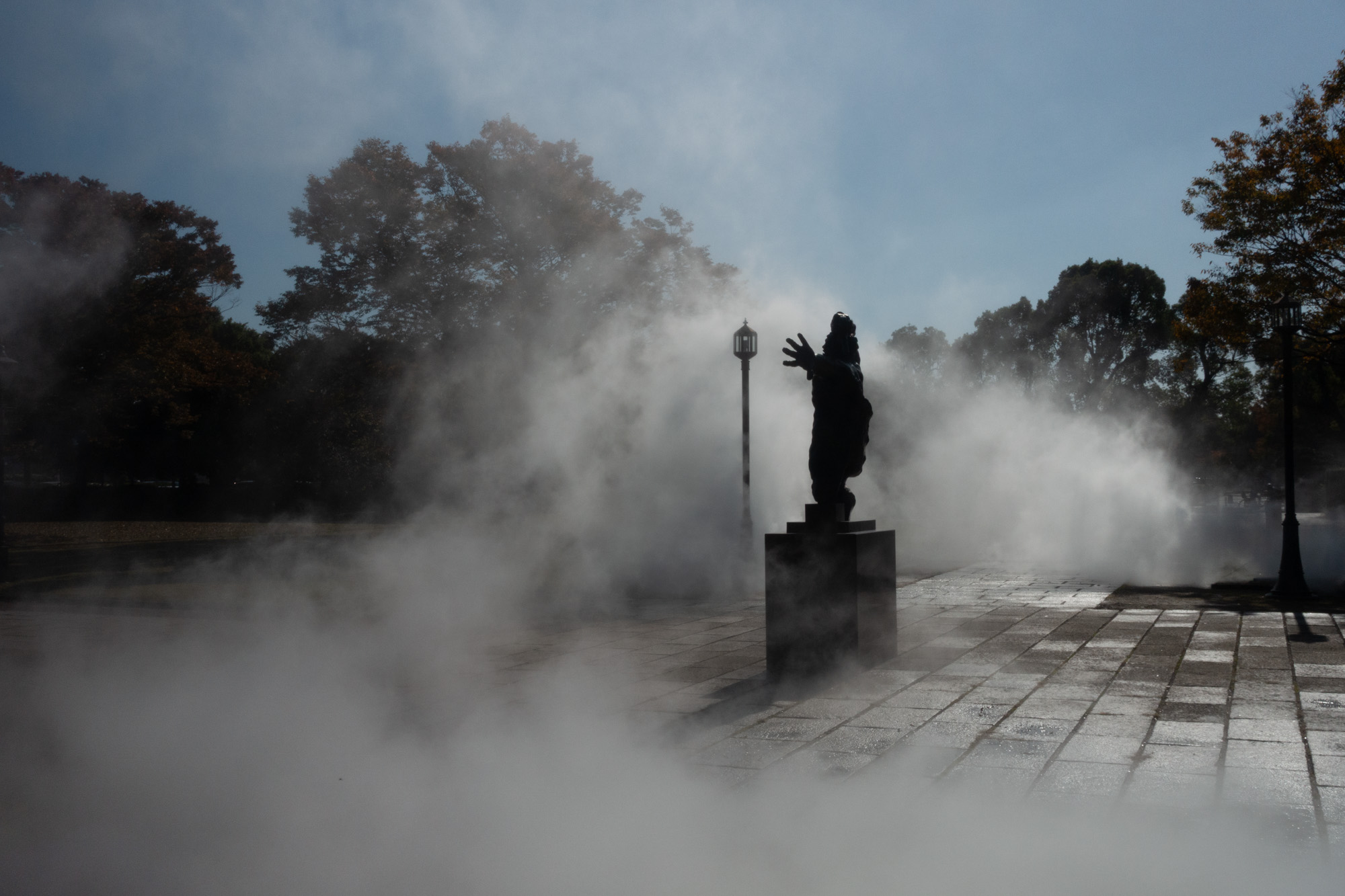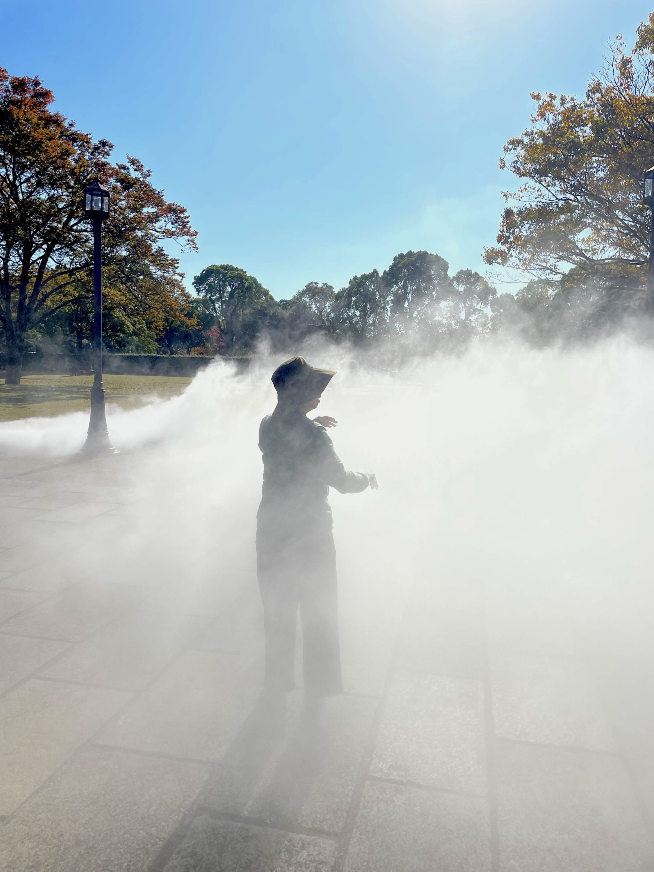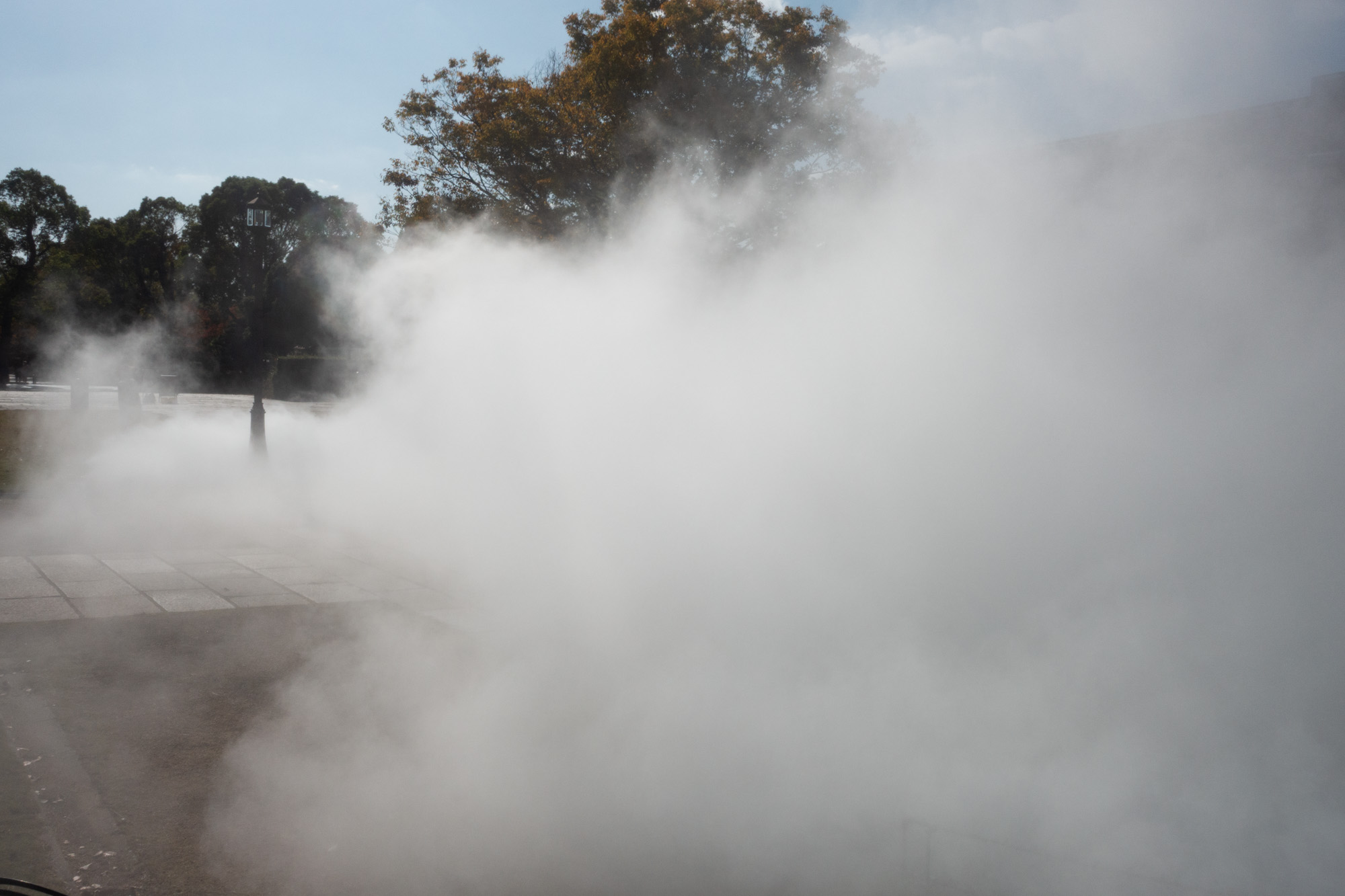 『モントーバンの戦士』のそばに、中谷があるノズルを地面に設置していました。そして30分に一回、数分間にそのノズルから霧が出されていました。その霧自体が中谷の彫刻になります。そうなんです。この彫刻の素材は「霧」です! センサーなどによって中谷の作品は環境や風や気温に反応するのです。それだけでもすごいと言えますが、技術的な話はやめておきたいです。もうお分かりだと思いますが、ここで語りたいのがこの彫刻の経験です。