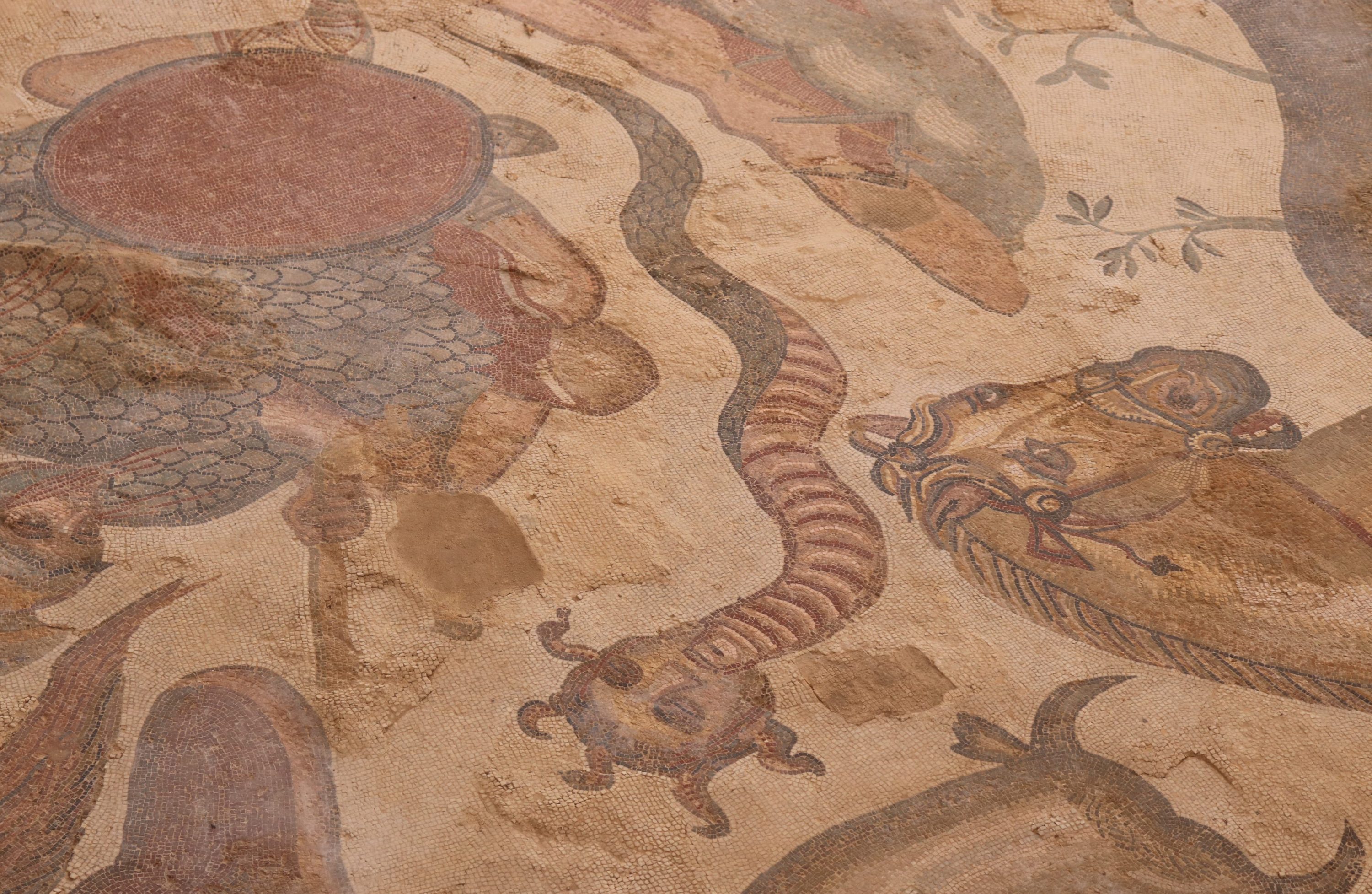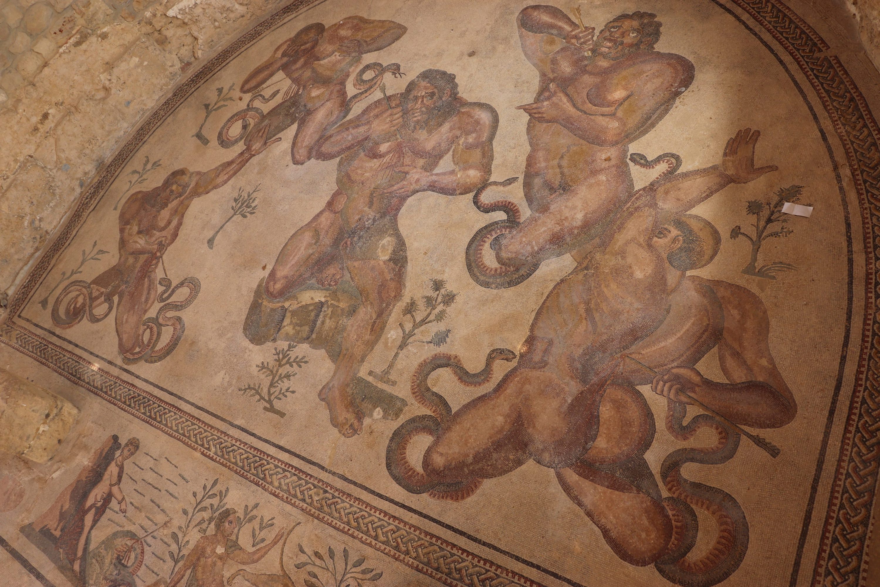 ギリシャ神話や狩猟をモチーフにした舗床モザイクが多く、私が特に心惹かれたのはヘラクレスが退治した怪物たちが描かれている大部屋(大食堂)です。
