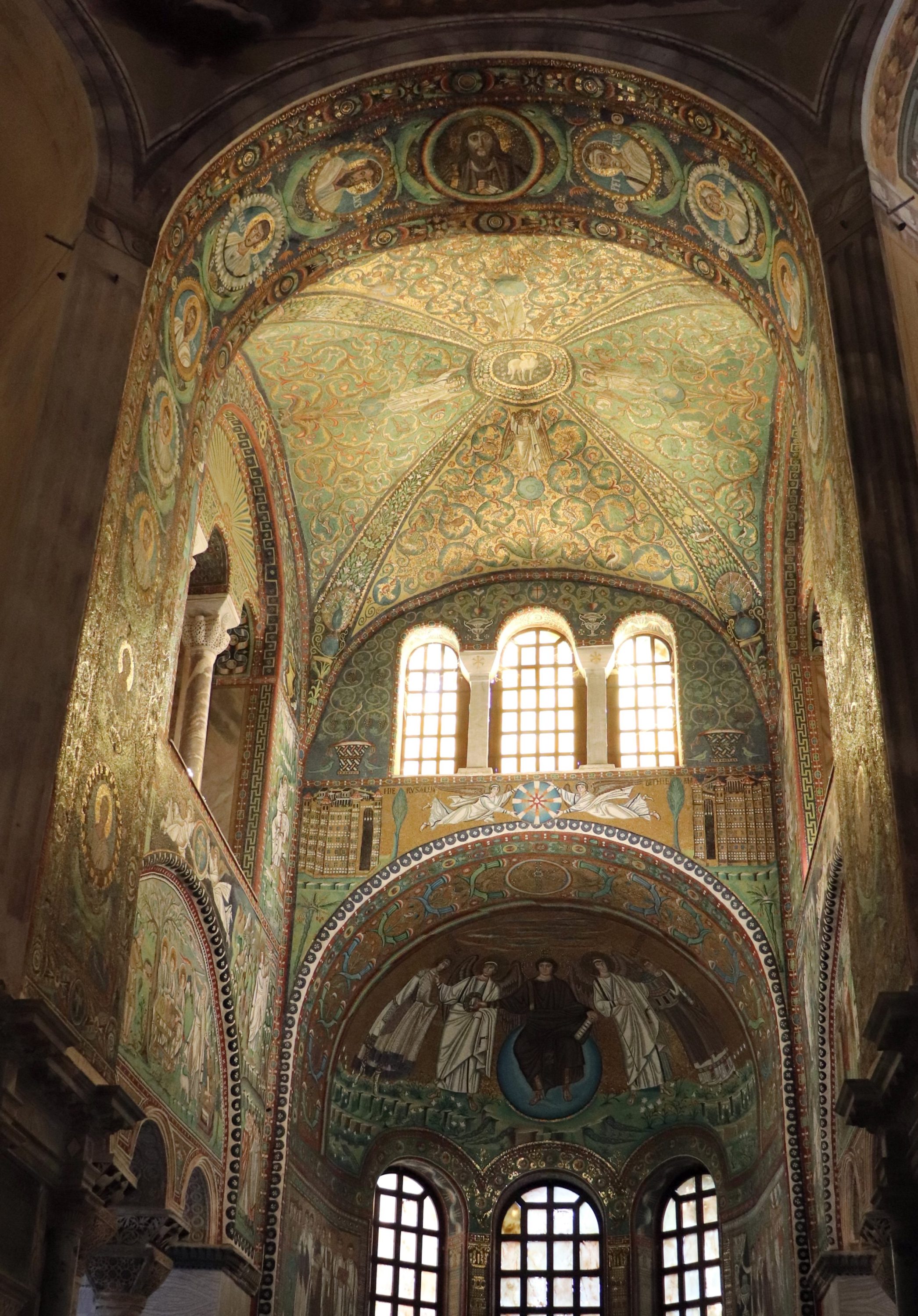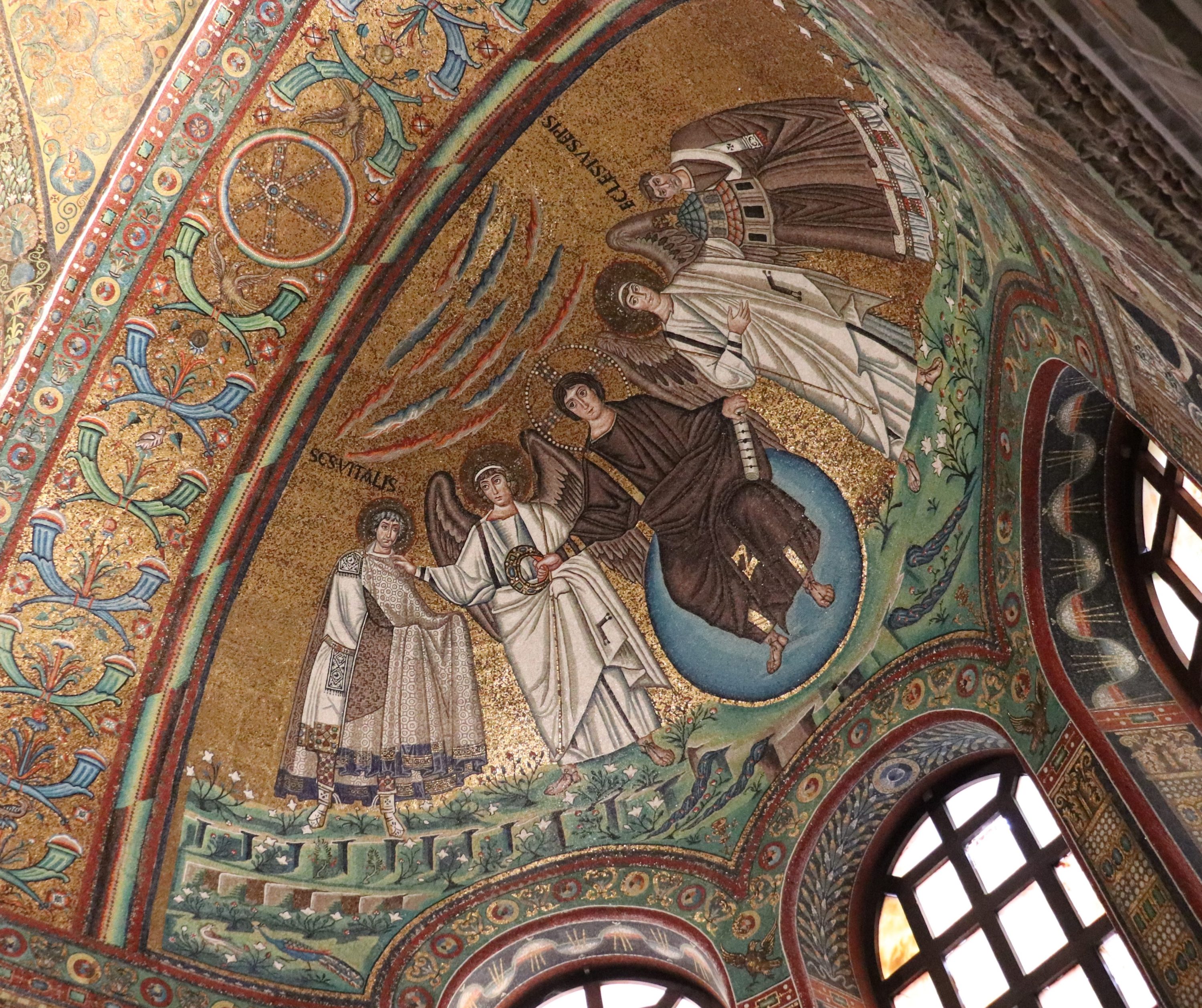 アプシス(後陣)中央には、イエスが天使を介して聖ヴィターレに王冠を授け、司教エクレシオからこの聖堂の模型を受け取る場面が描かれています。その下、窓の両脇にはビザンチン帝国の皇帝や皇后の姿も見ることができます。