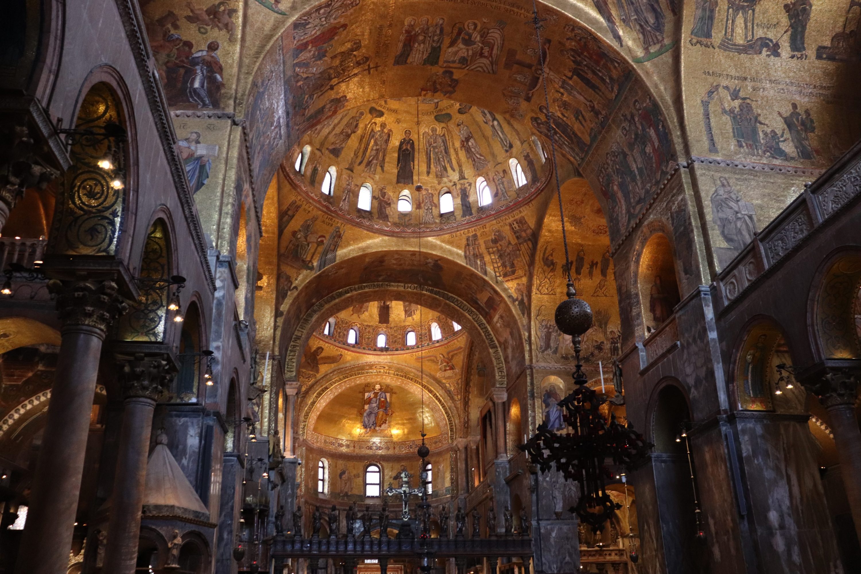サン・マルコ大聖堂の堂内は、約8,000平方メートルに及ぶ黄金のモザイク壁に包まれています。