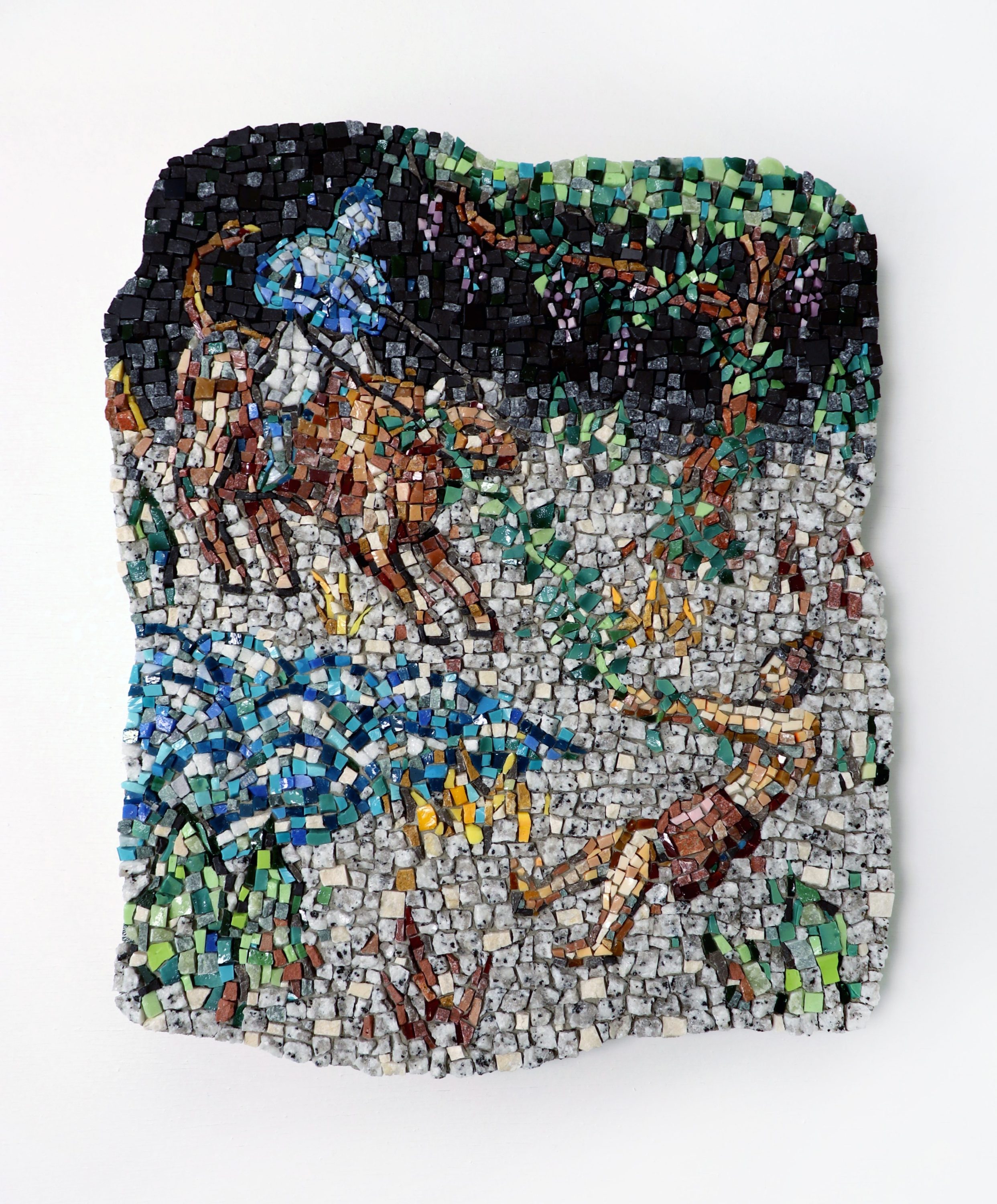 モザイクは石を素材とするため非常に耐久性が高く、色褪せることなく作品を未来へ残すことができます。まるで古くから語り継がれる民話のように。そして、少し現実離れした民話や伝承の世界を描くのに、はっきりと描けてしまう油絵ではなく、モザイク特有の“解像度の低さ”がむしろぴったりだと感じたのです。