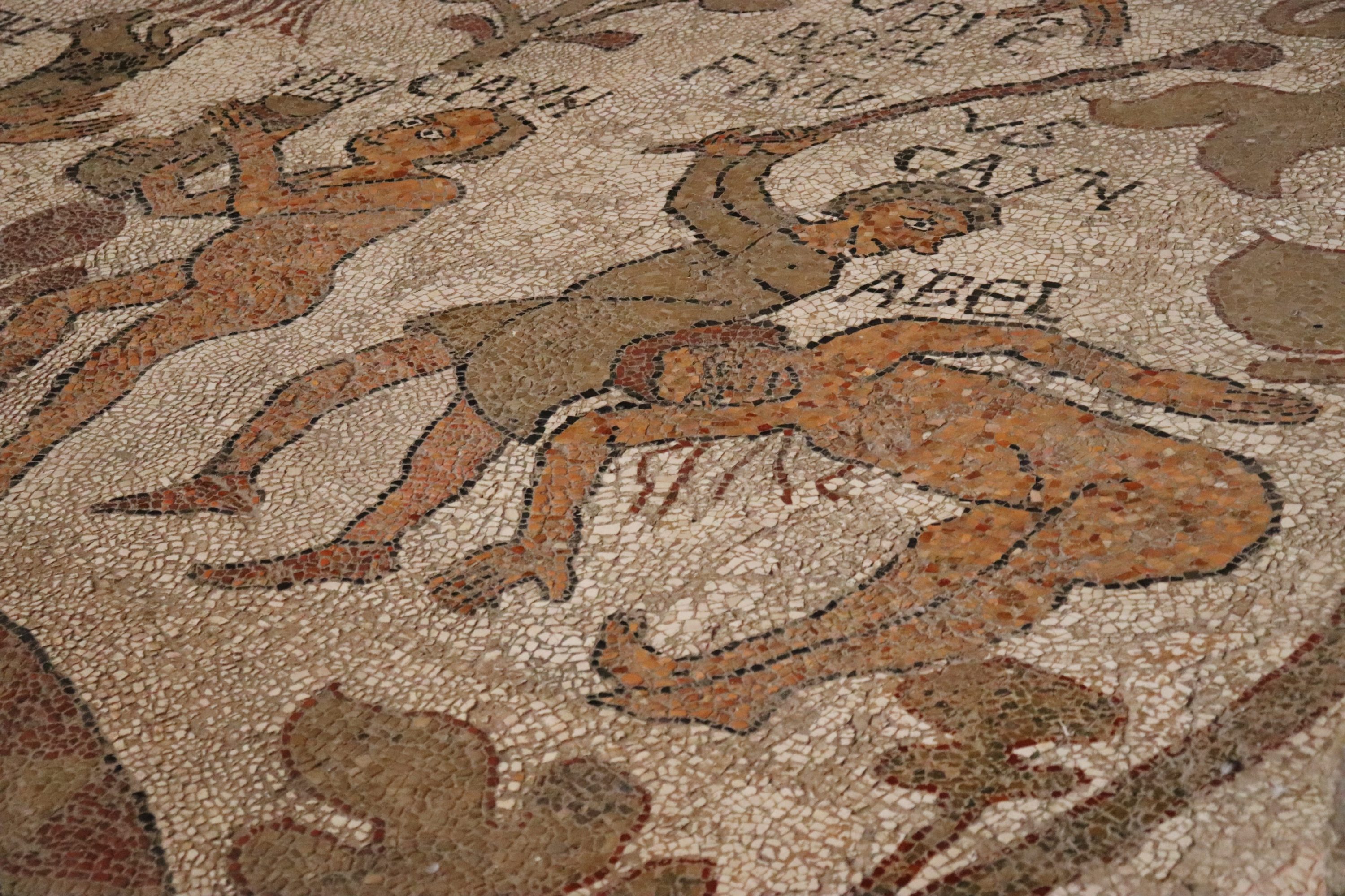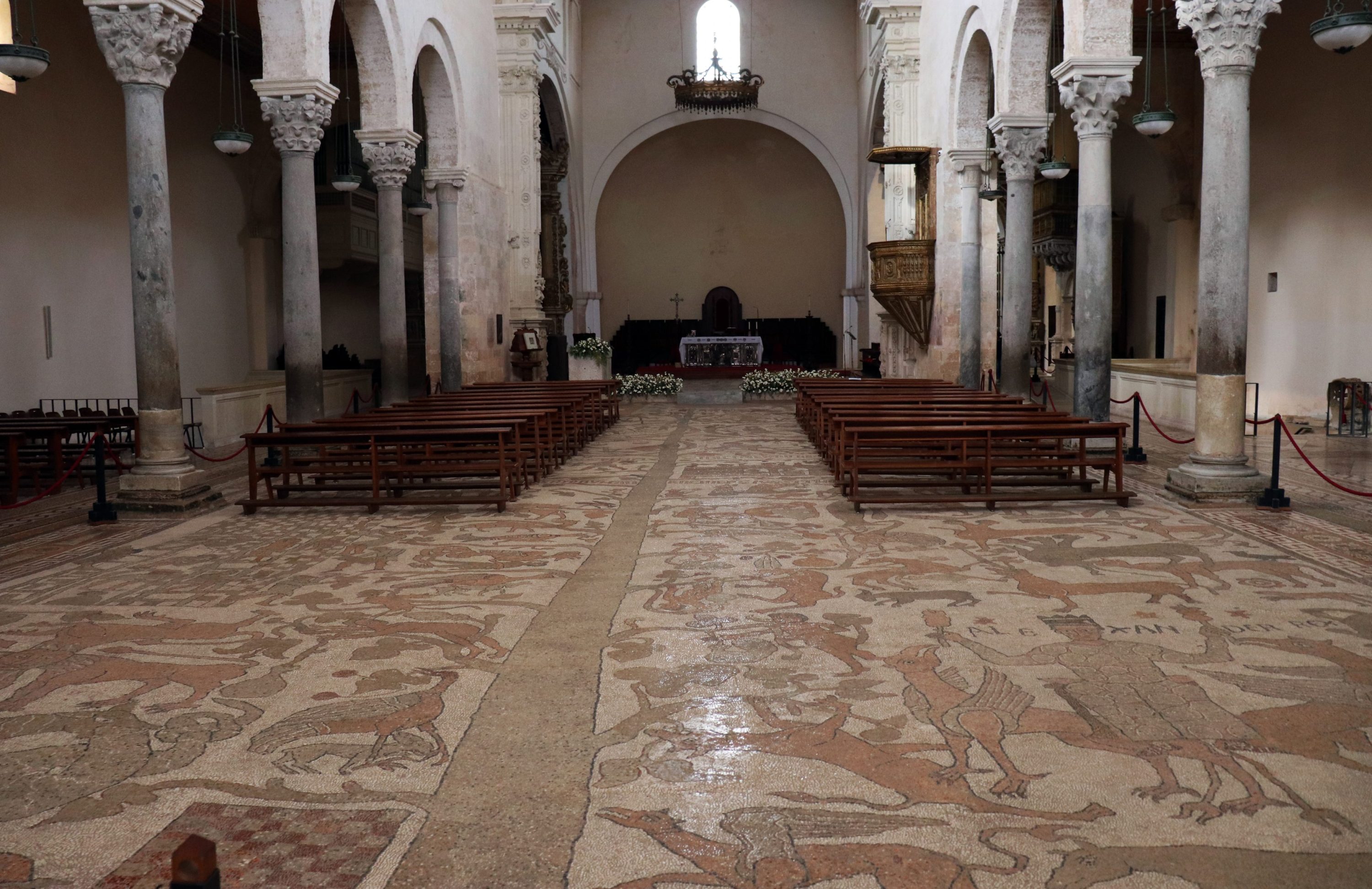 聖堂の内部には「生命の樹」をモチーフにした舗床(ほしょう)モザイクがあり、キリスト教の旧約聖書の場面が描かれています。