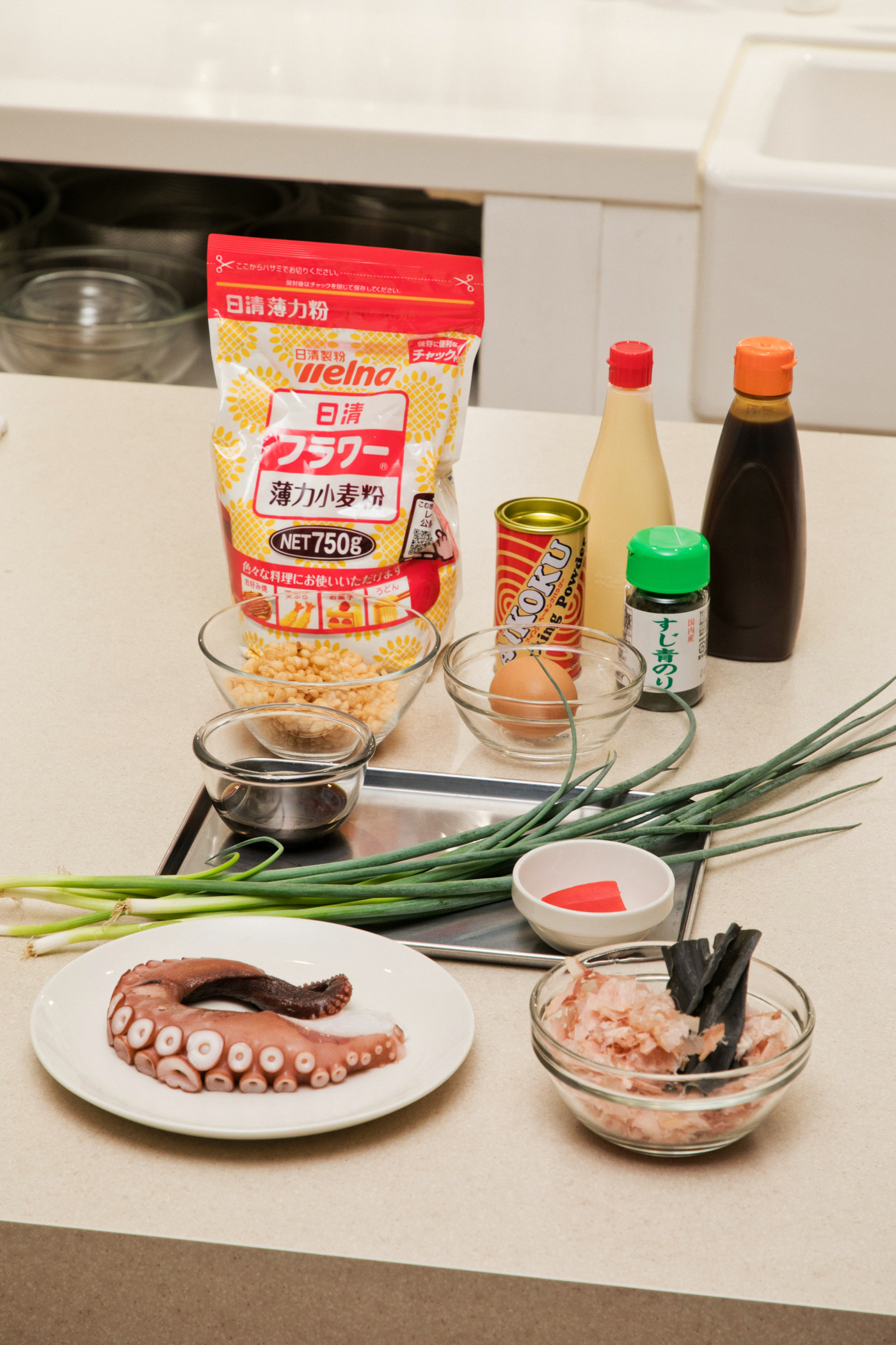 材料は、小麦粉200g、ペーキングパウダー小さじ2分の1、卵1個、たこ、ねぎ、紅しょうが、揚げ玉、醤油、昆布、鰹節。トッピング用にソース、マヨネーズ、青のり。