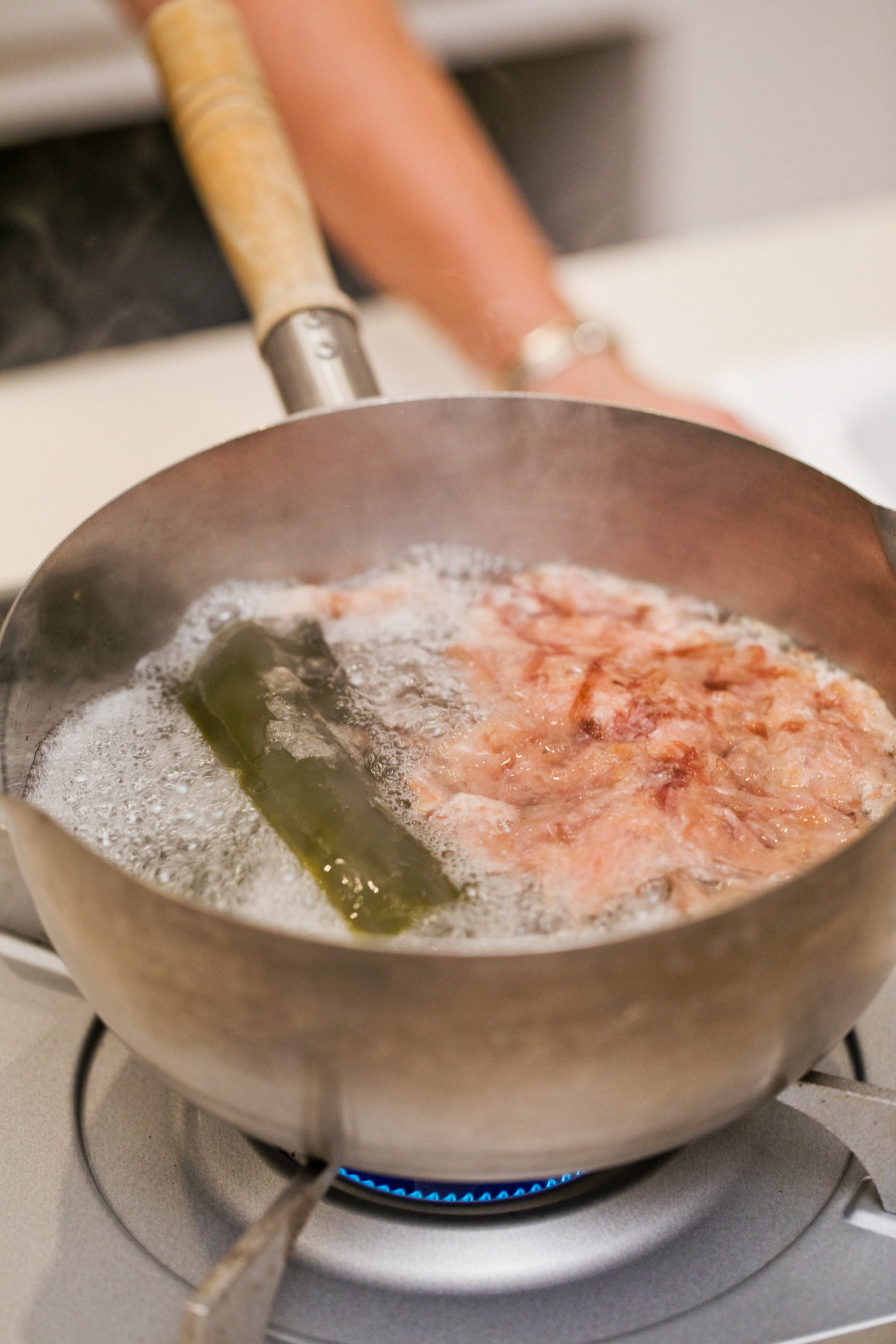 二番出汁をとってしっかり冷ます。出汁が温かいとたこ焼き液に入れるときに卵が固まってしまうので気をつける。