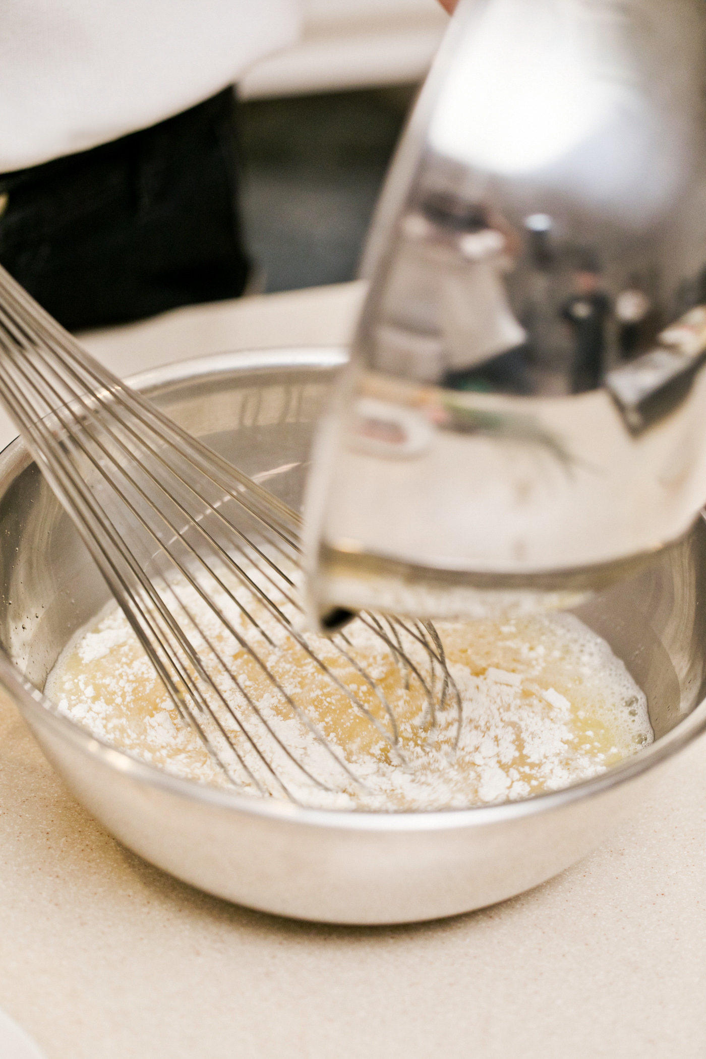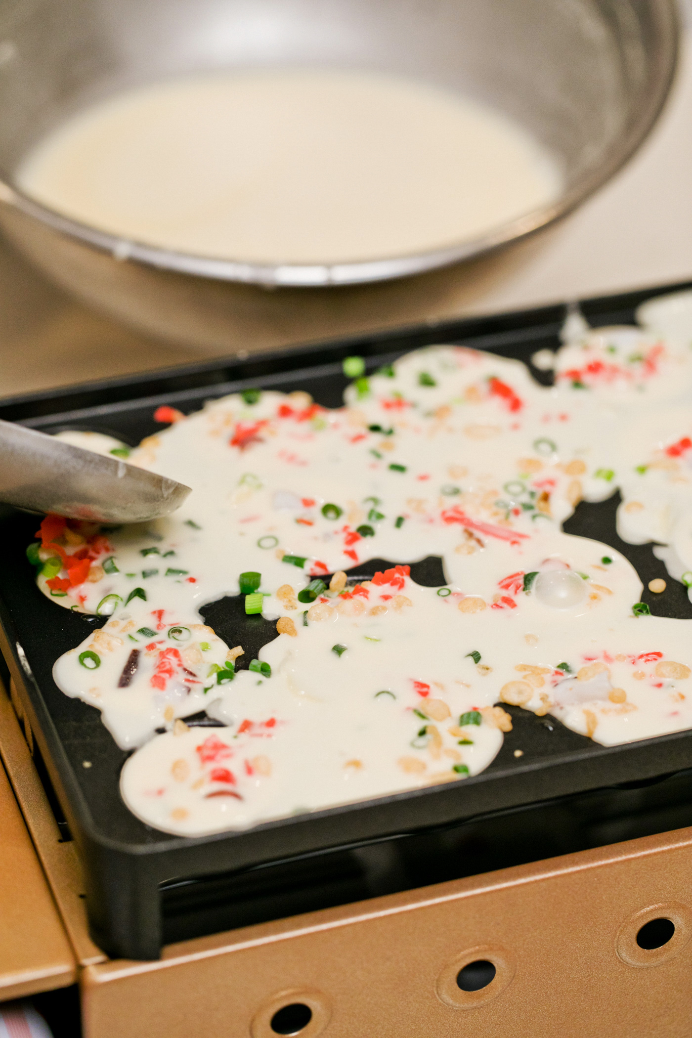 たこ焼き液を作る。卵を溶いて二番だし600mlを加えてから、醤油小さじ1、小麦粉、ペーキングパウダーを入れる。