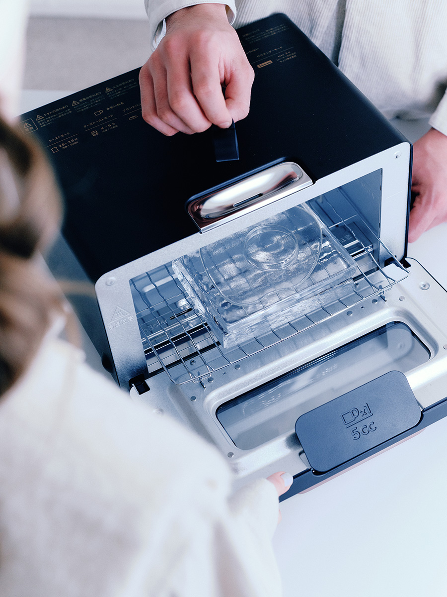 ホームパーティの翌朝。ふたりの新しいモーニングの相棒は、こちらのスチームトースター。トーストと目玉焼き、いつもの定番メニューをグレードアップしてくれると聞きつけていたので、昨日から使うのを楽しみにしていた。