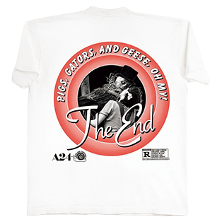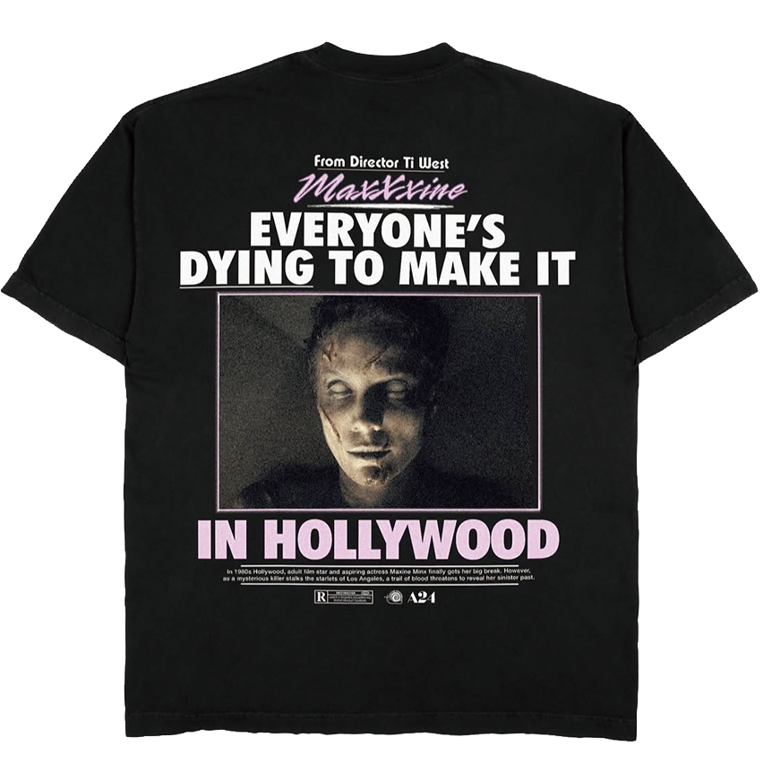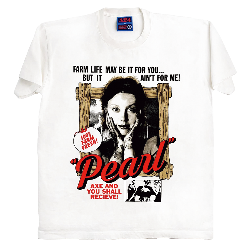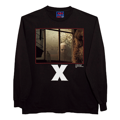 1979年テキサス。ポルノ映画撮影のため農場を訪れた若者たちは、撮影を覗き見た老夫婦に襲われる。Tシャツ前面には切ない顔で窓を覗くパールおばあちゃん、背面はその窓から見える撮影風景ということで、切り返しショットを表現したシネマティックな一枚。